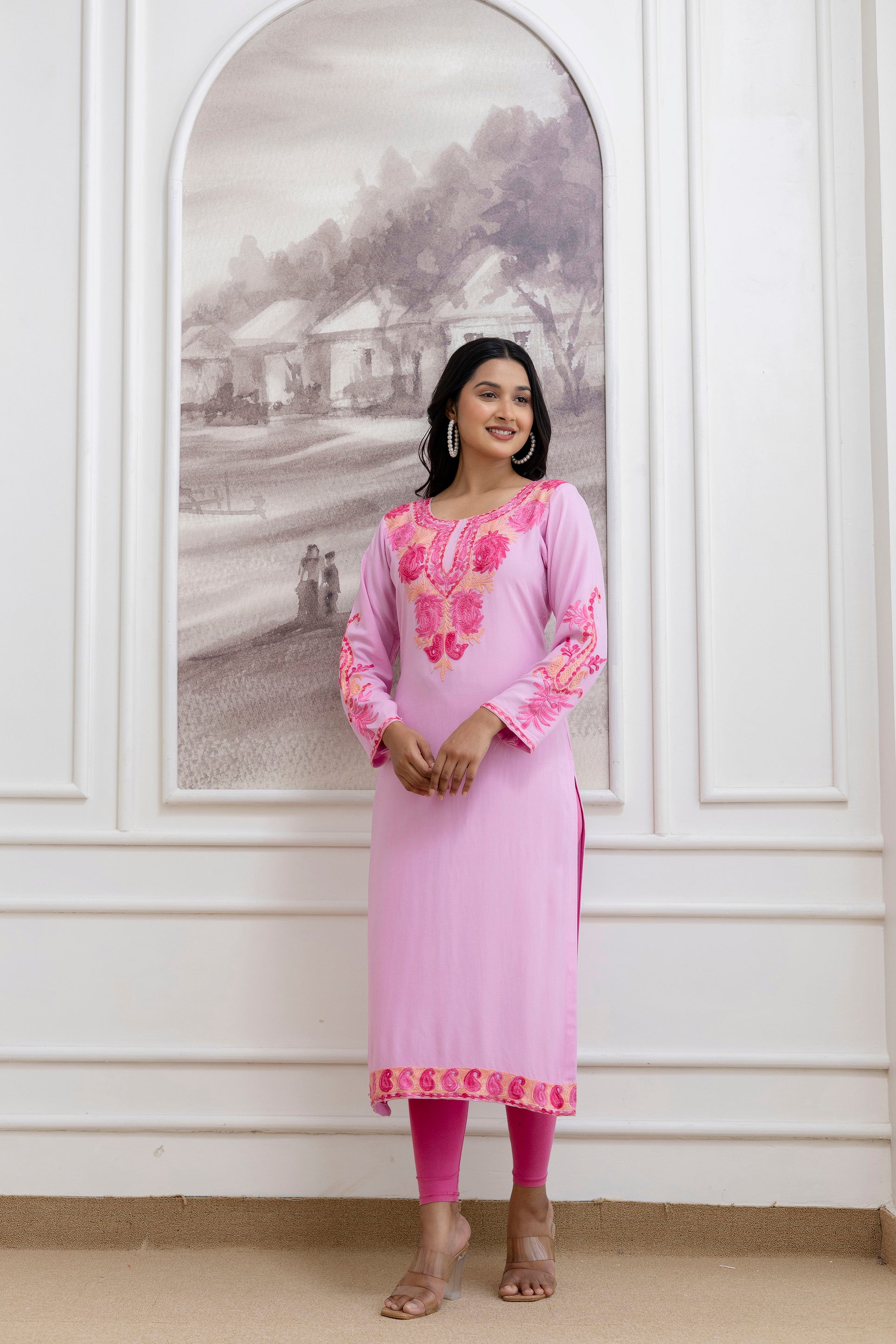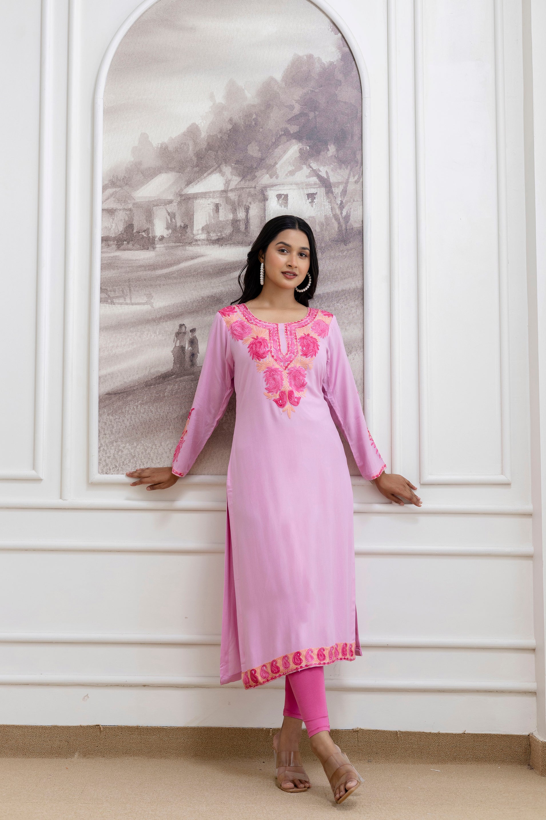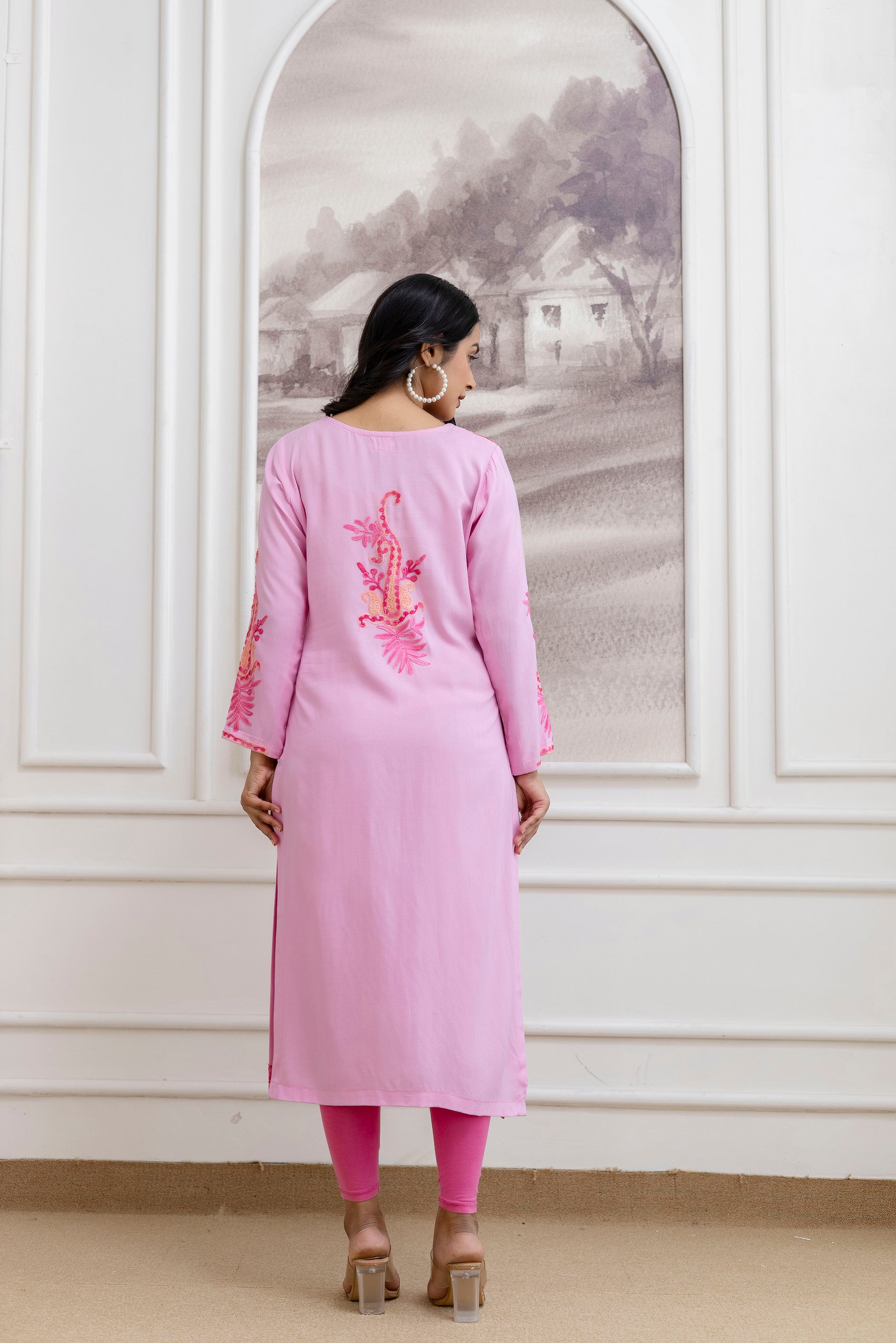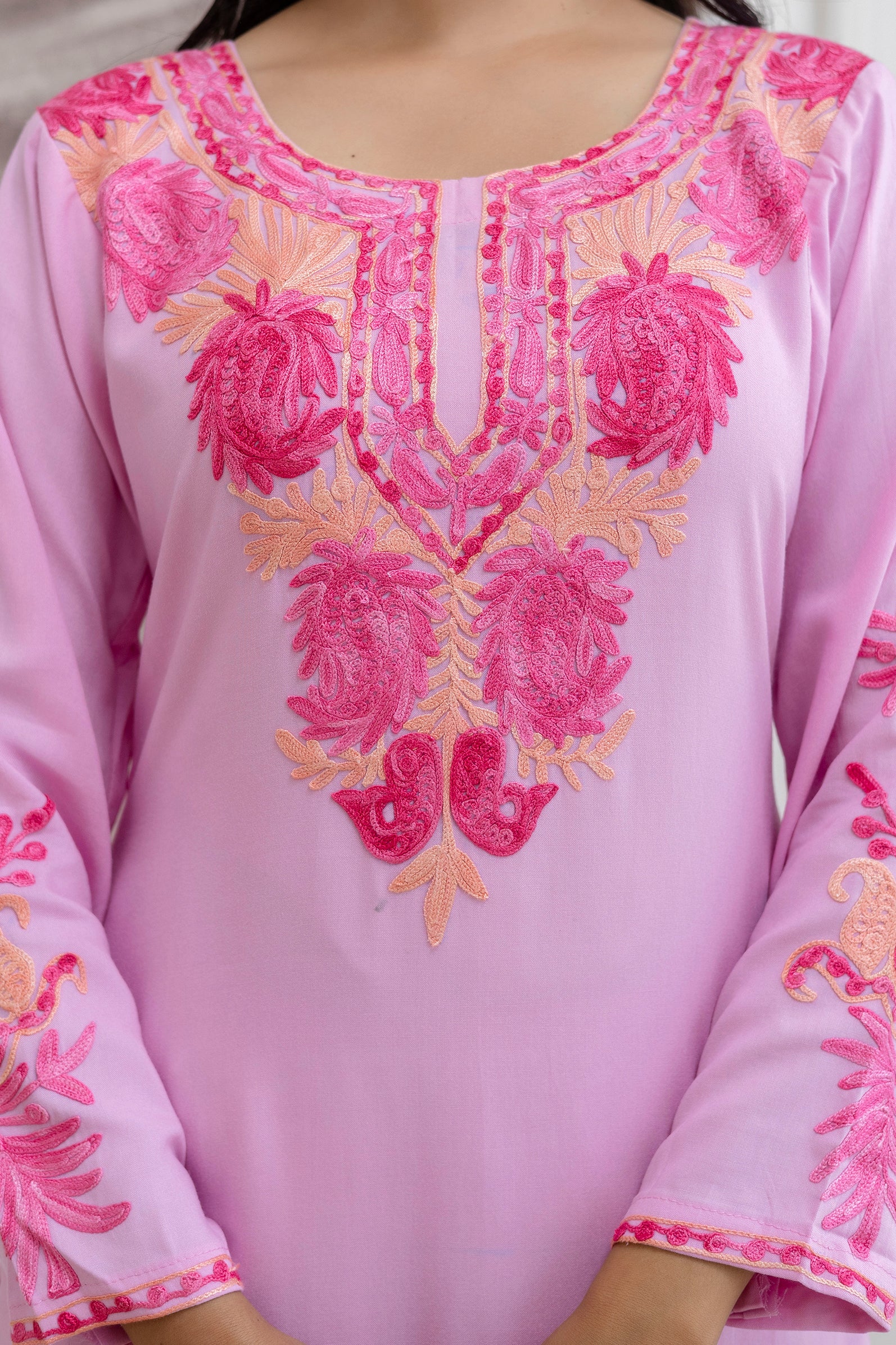 TOK Aari Embroidered Cotton Solid Women's Long Kurta - Pastel Pink