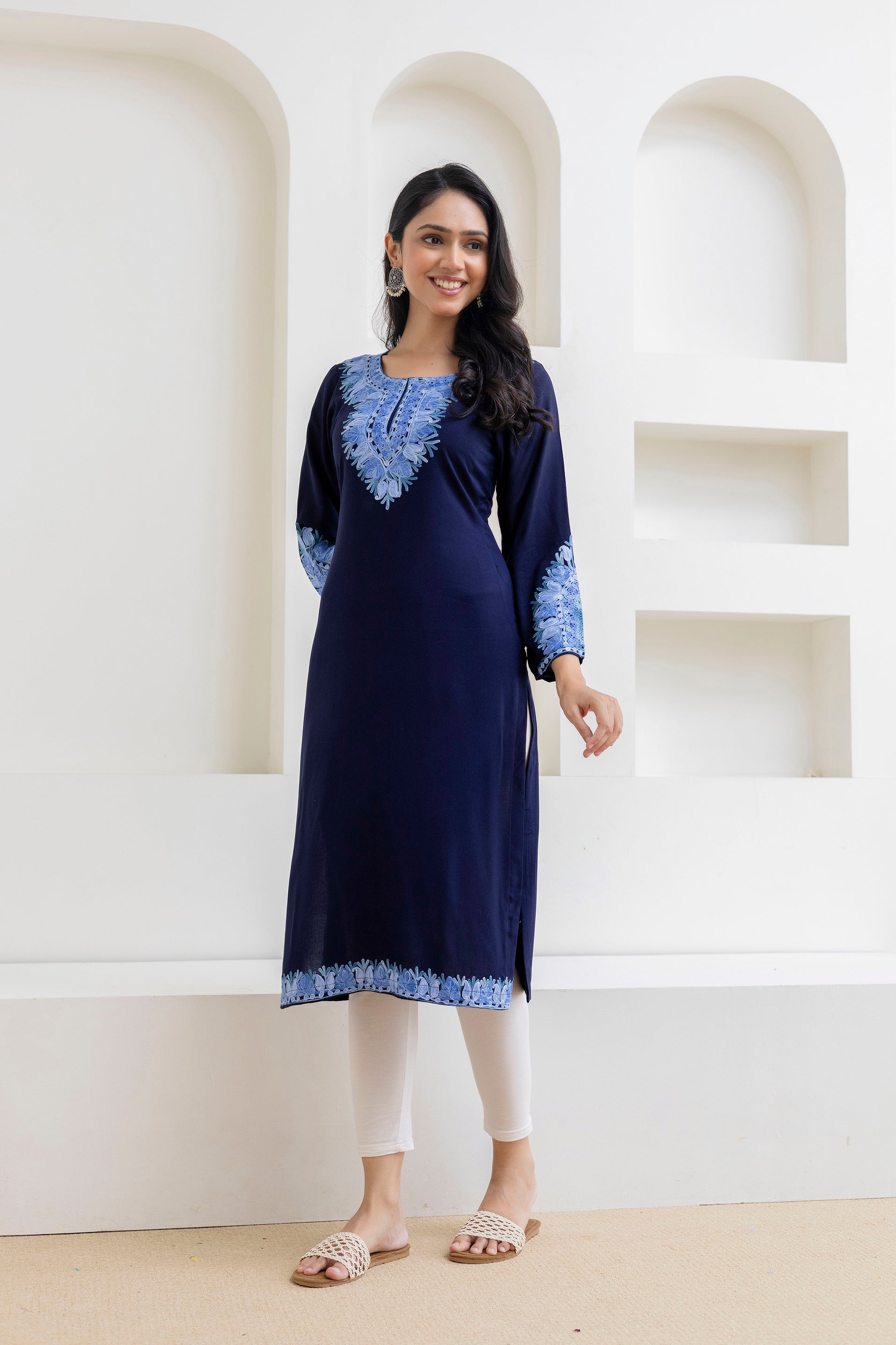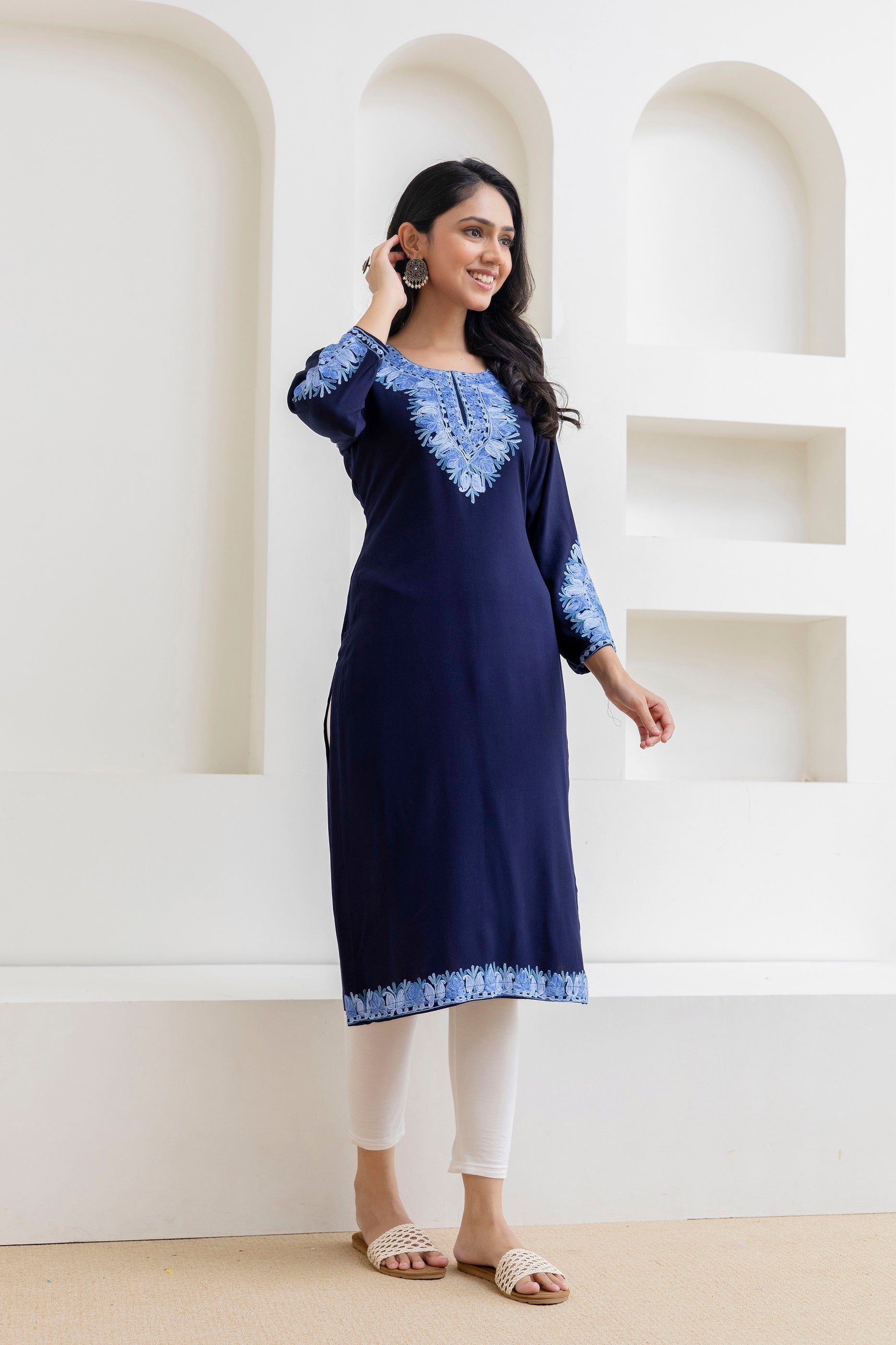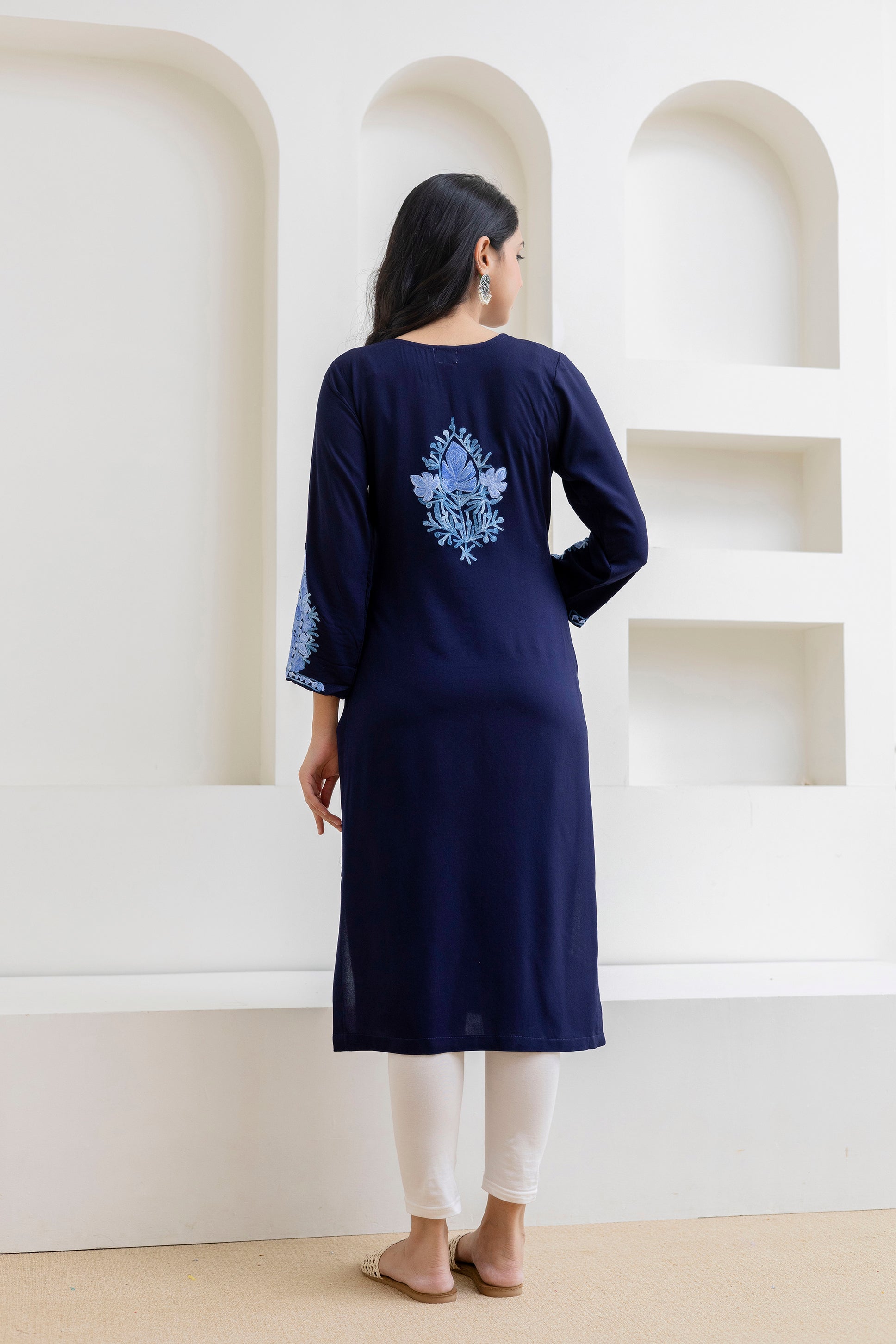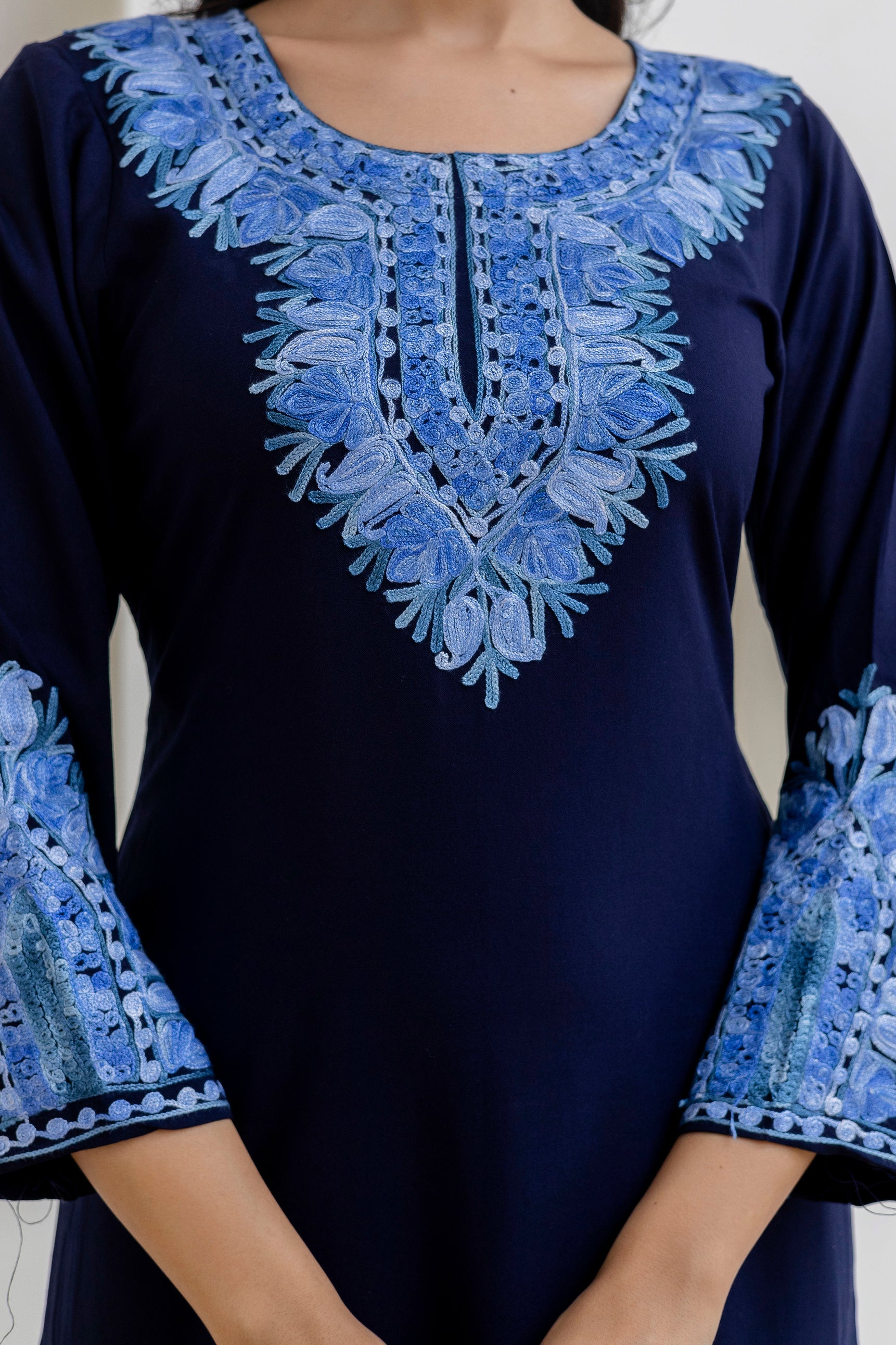 Navy Blue Cotton Kashmiri Aari Embroidered Kurti