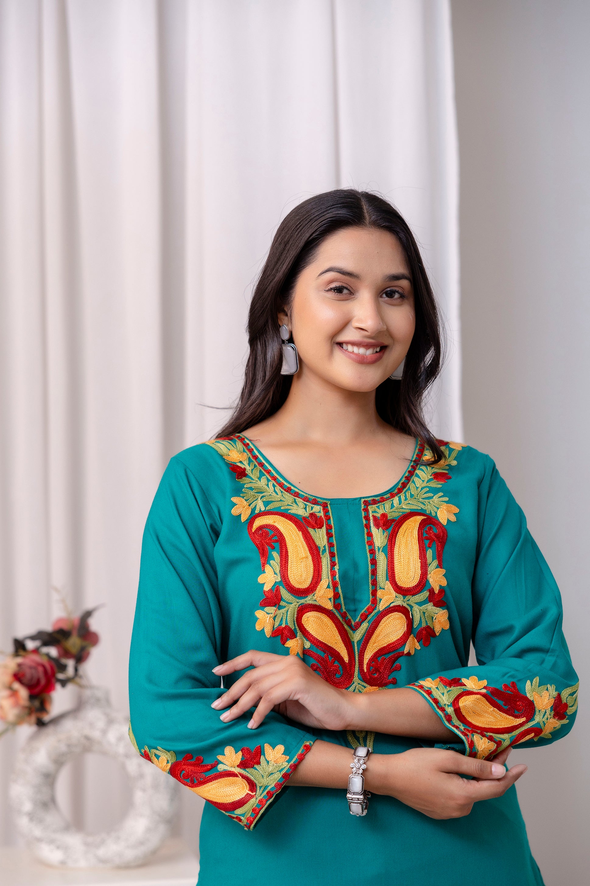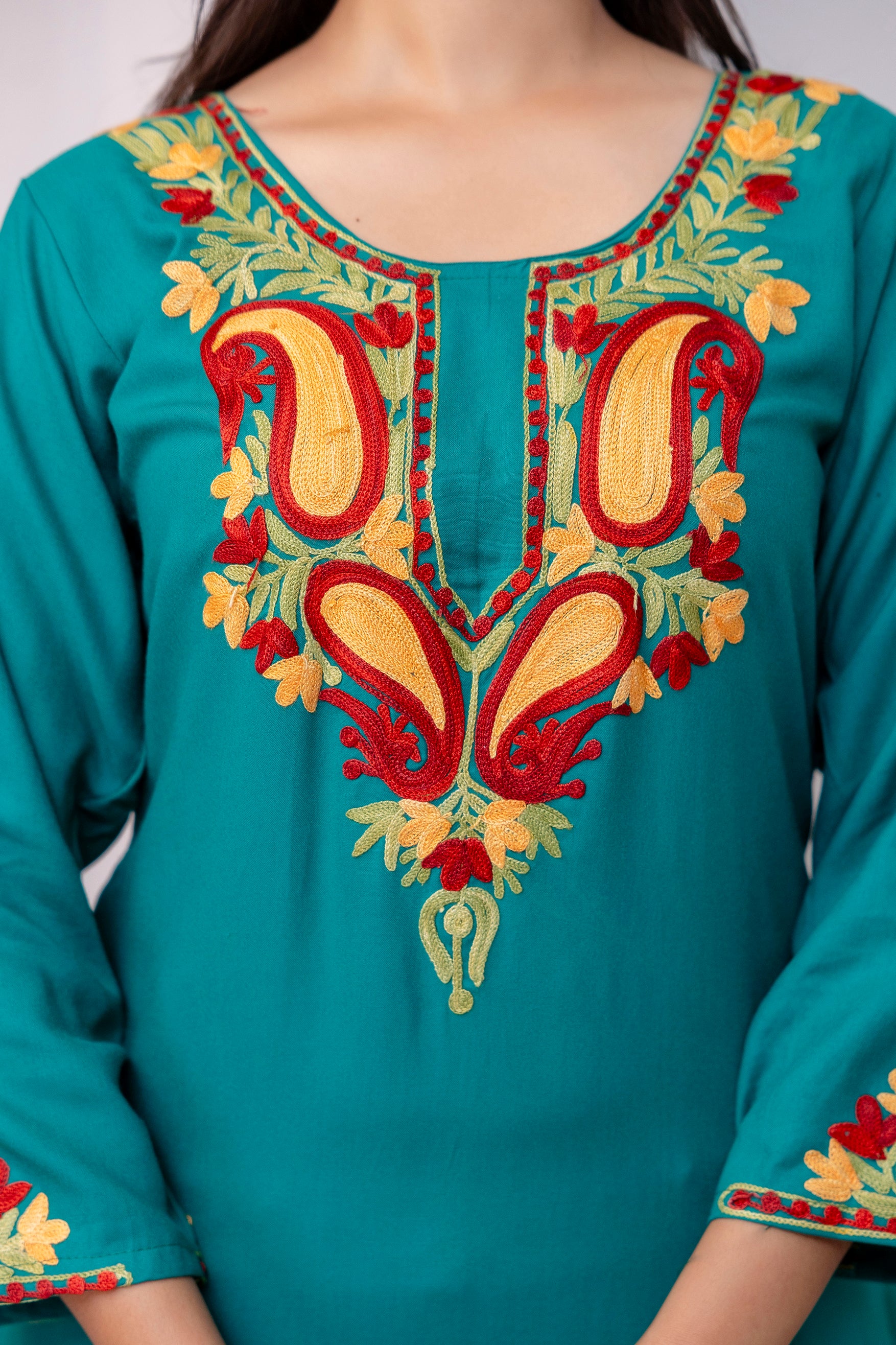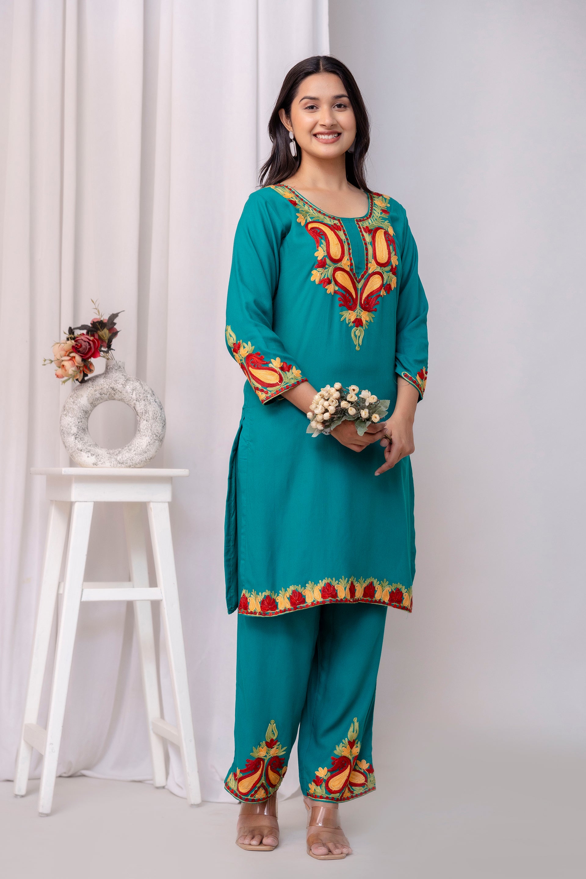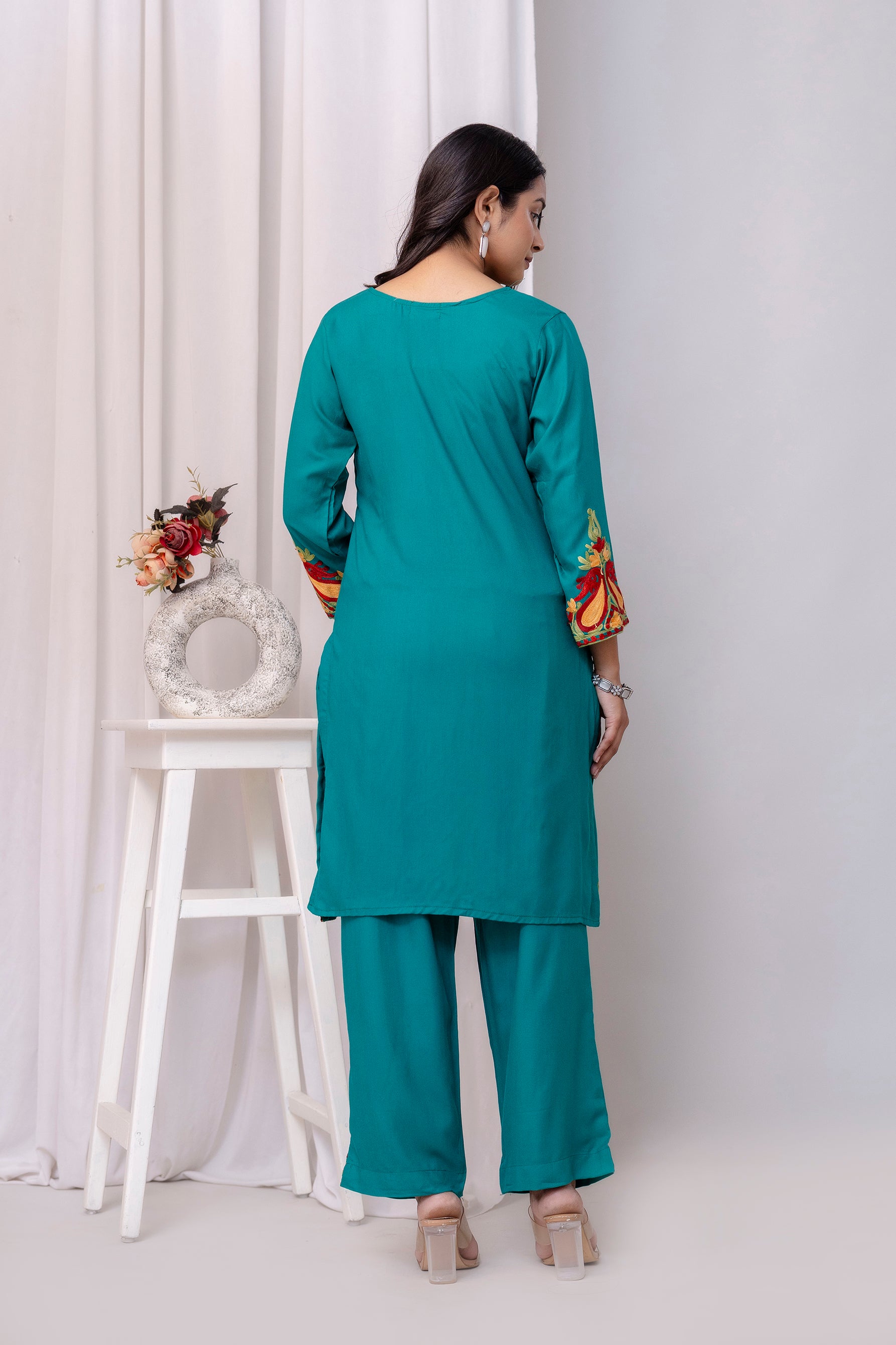 TOK Aari Embroidered Cotton Solid Women's 2PC Co-ord Set - Persian Green