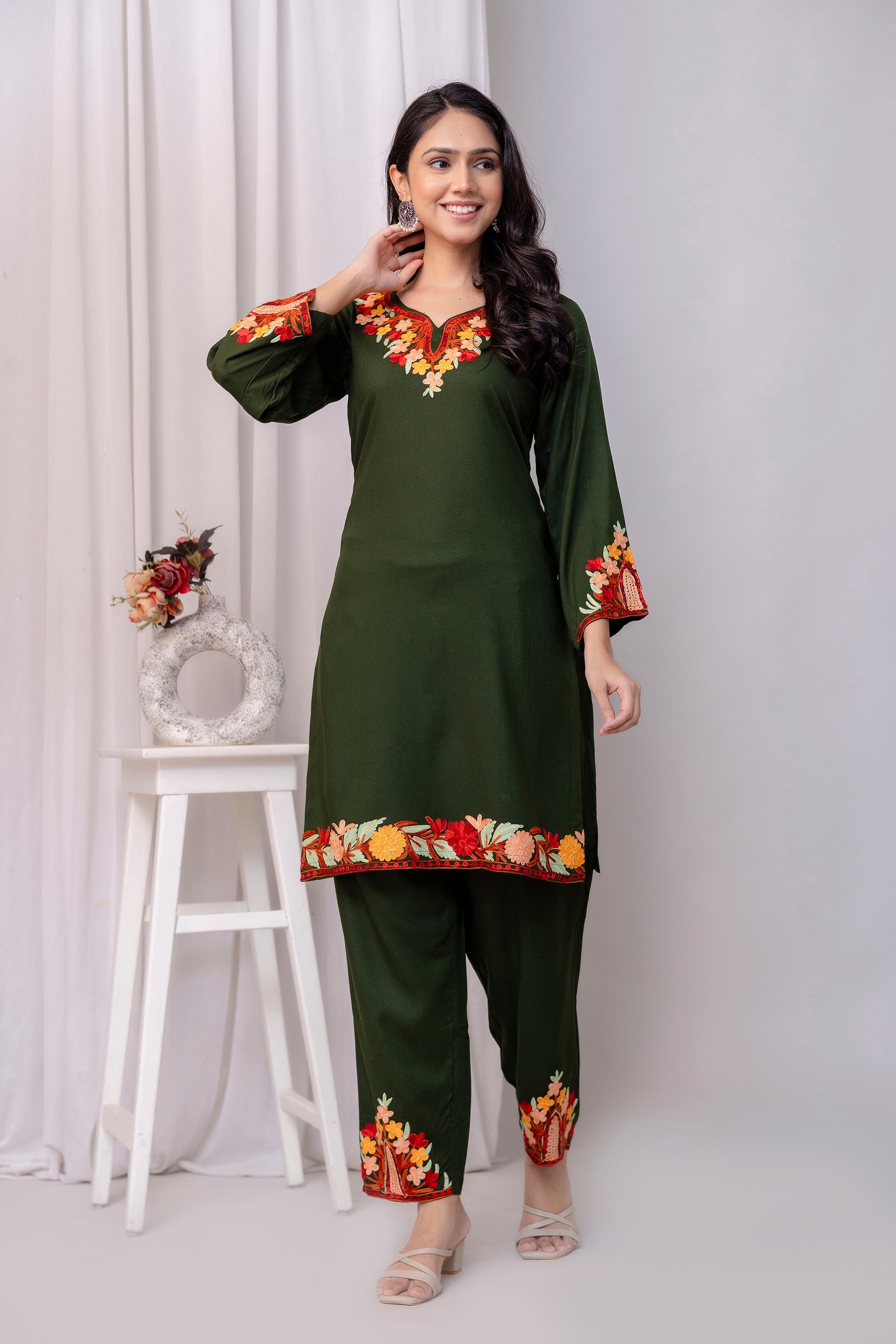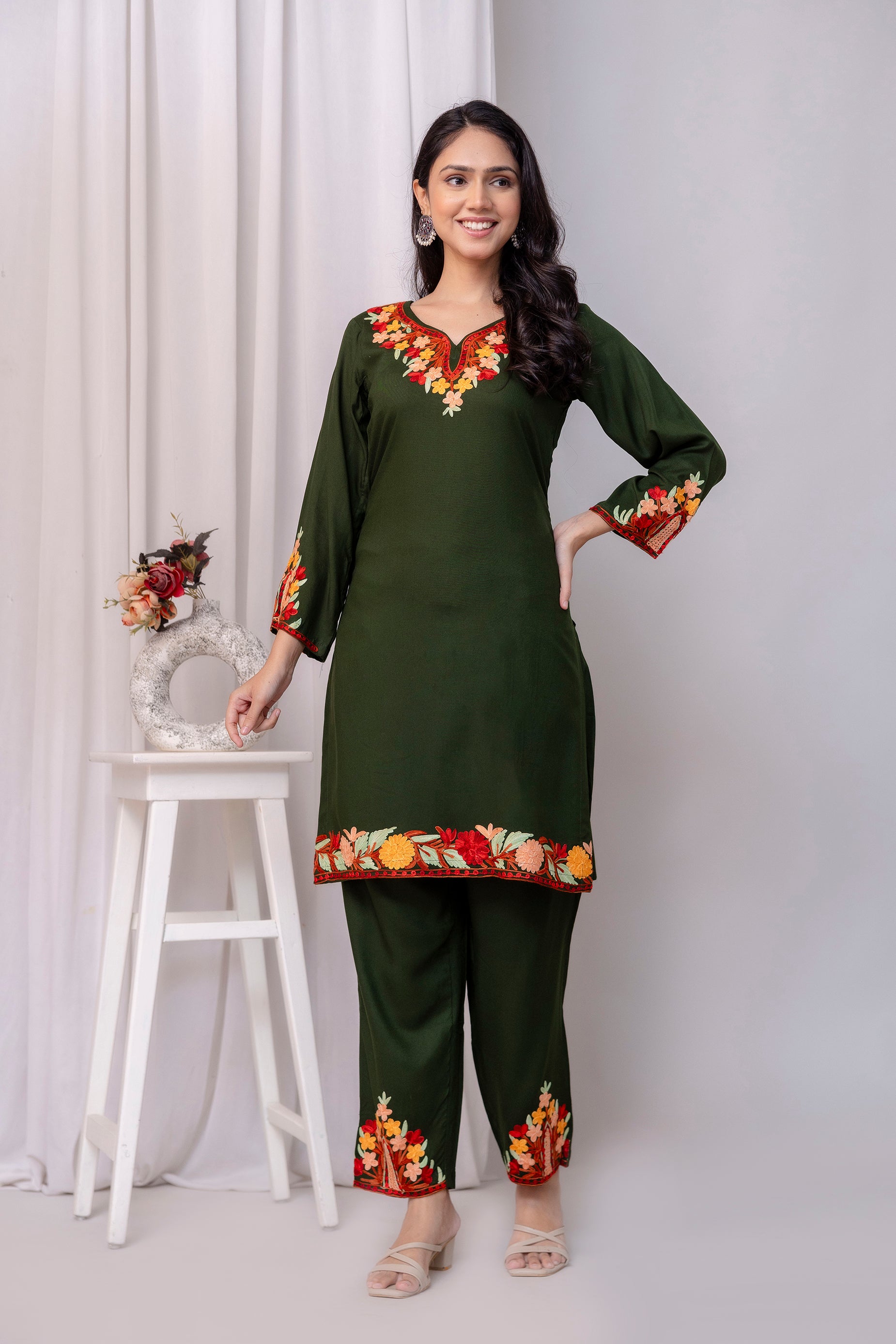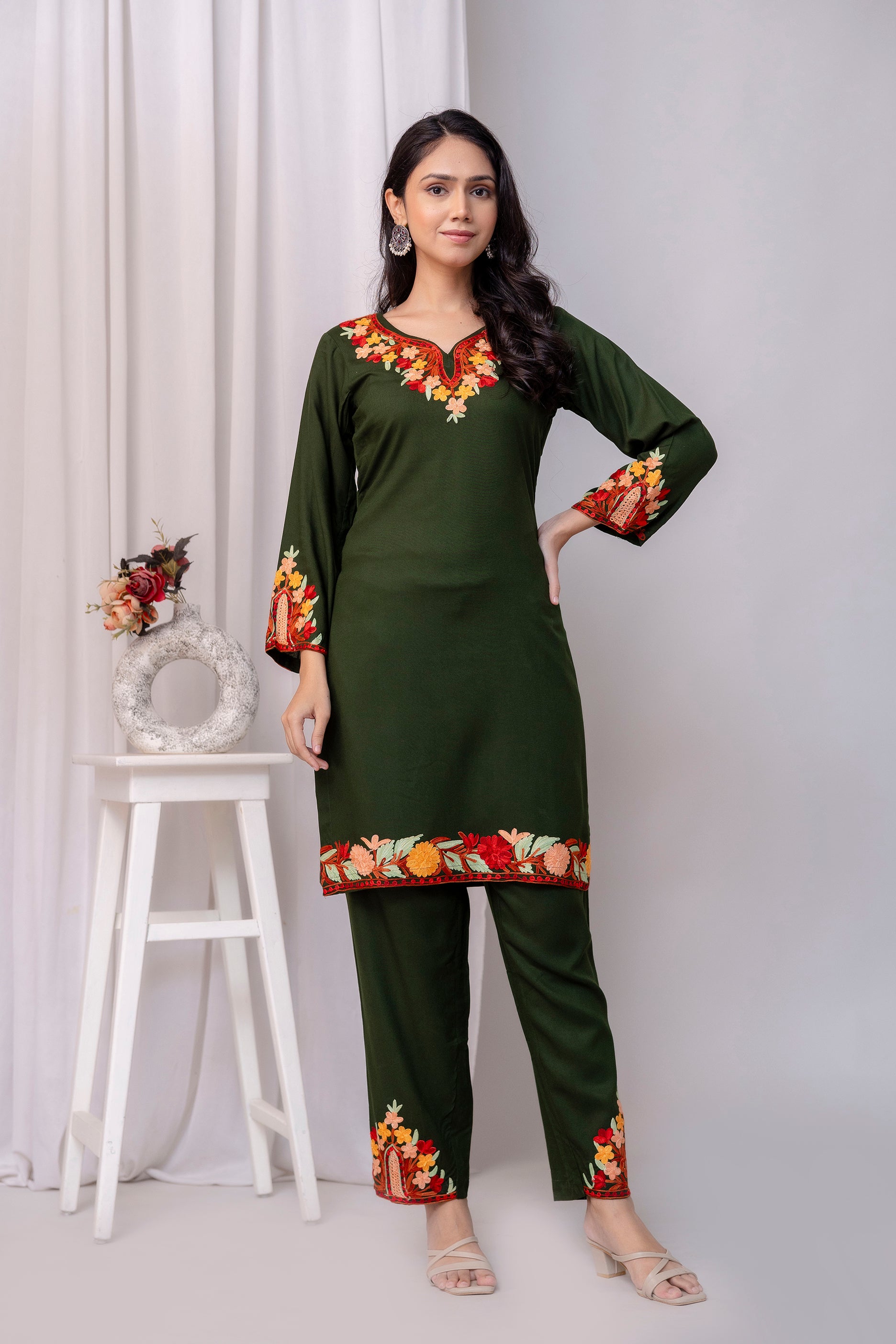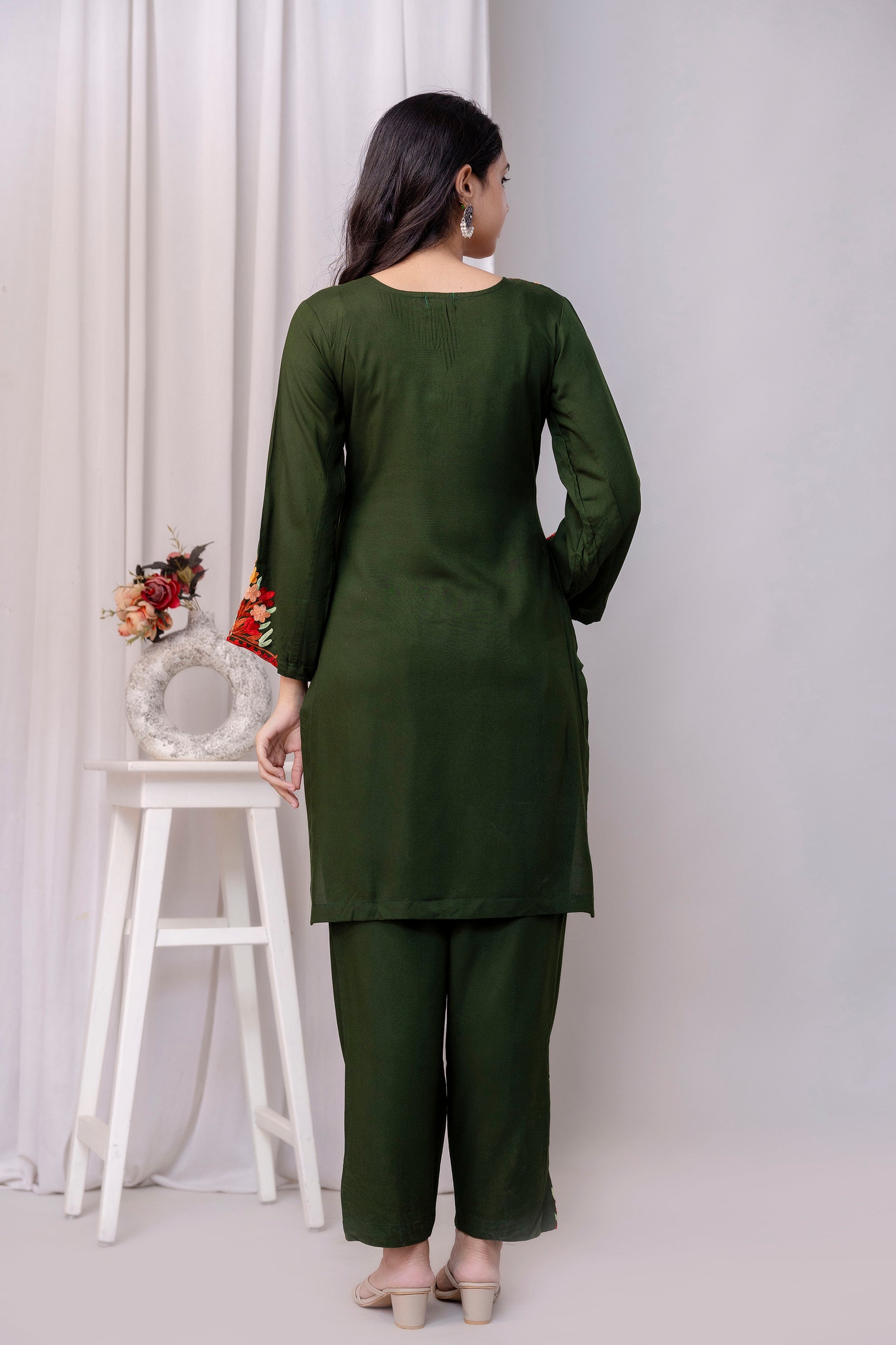 TOK Aari Embroidered Cotton Solid Women's 2PC Co-ord Set - Olive Green