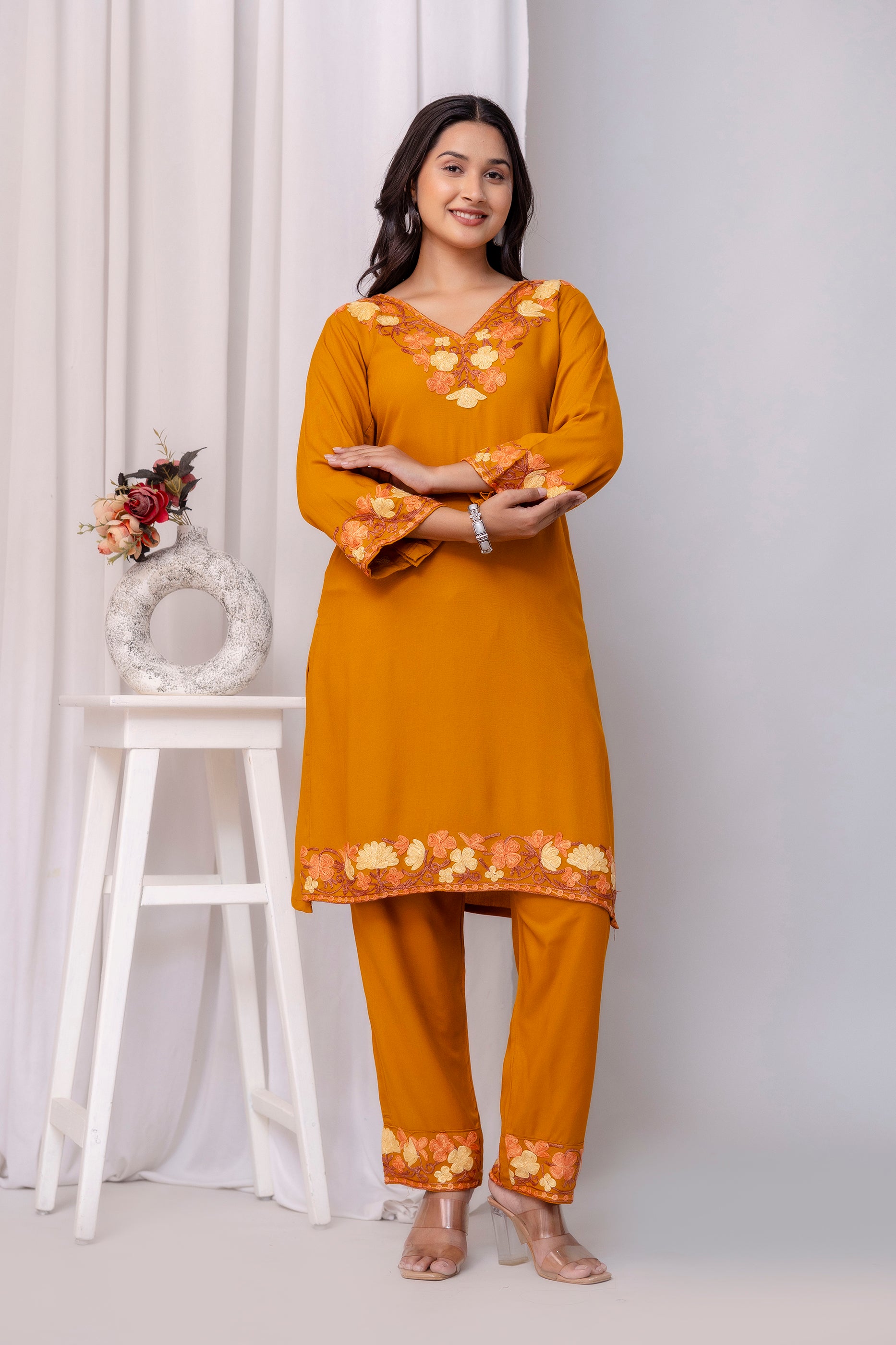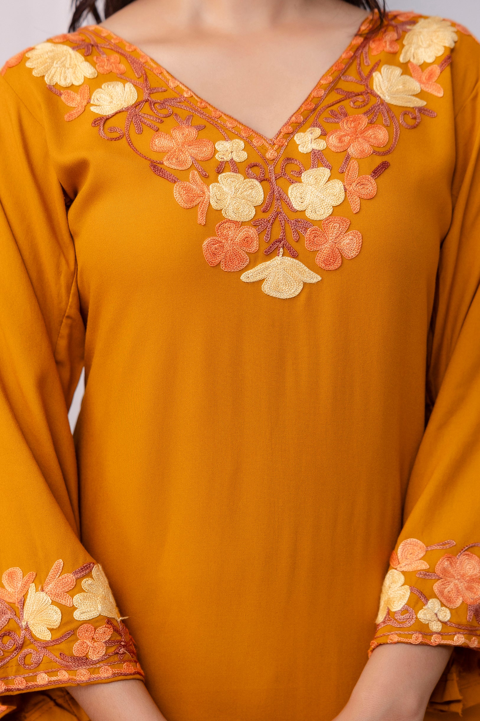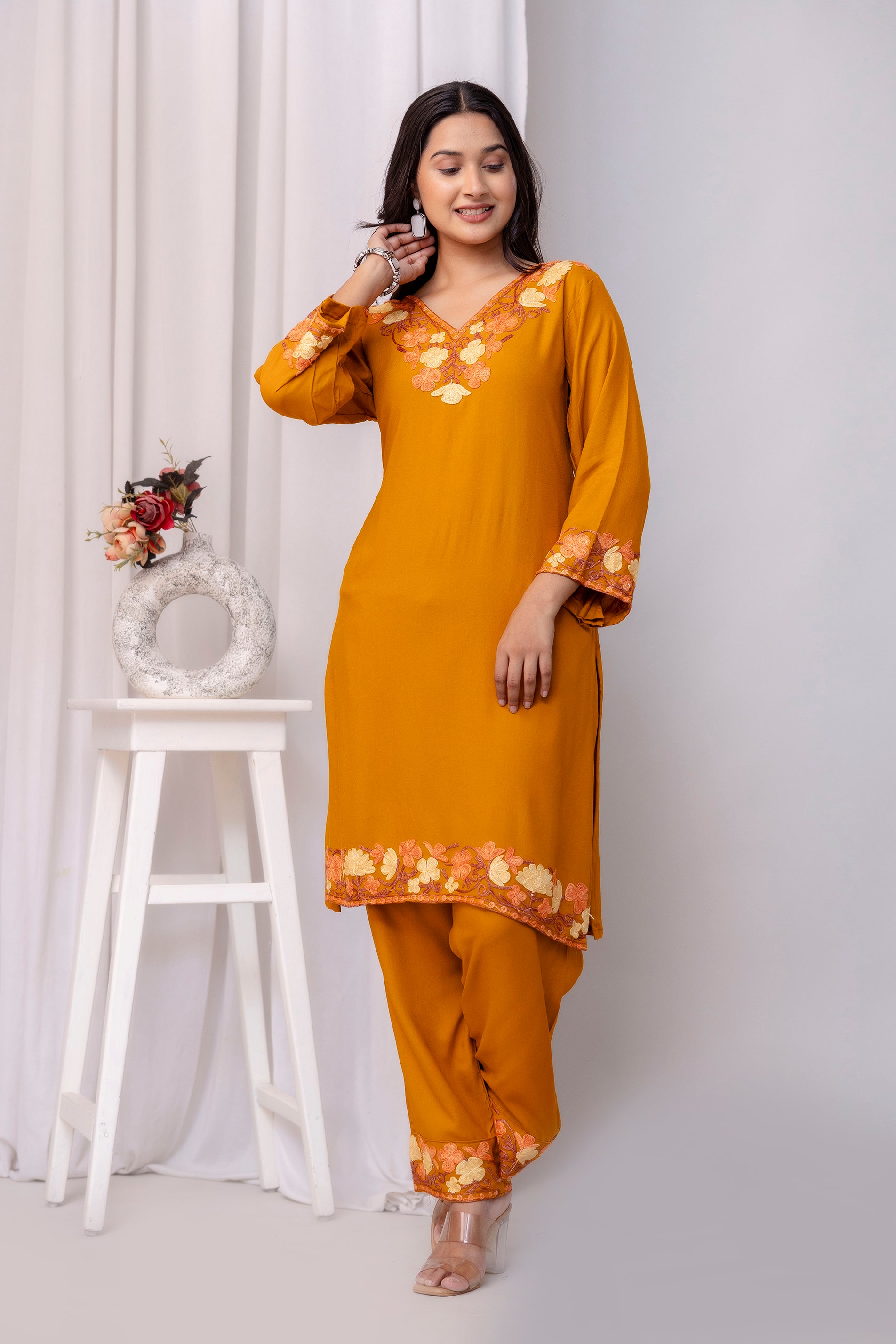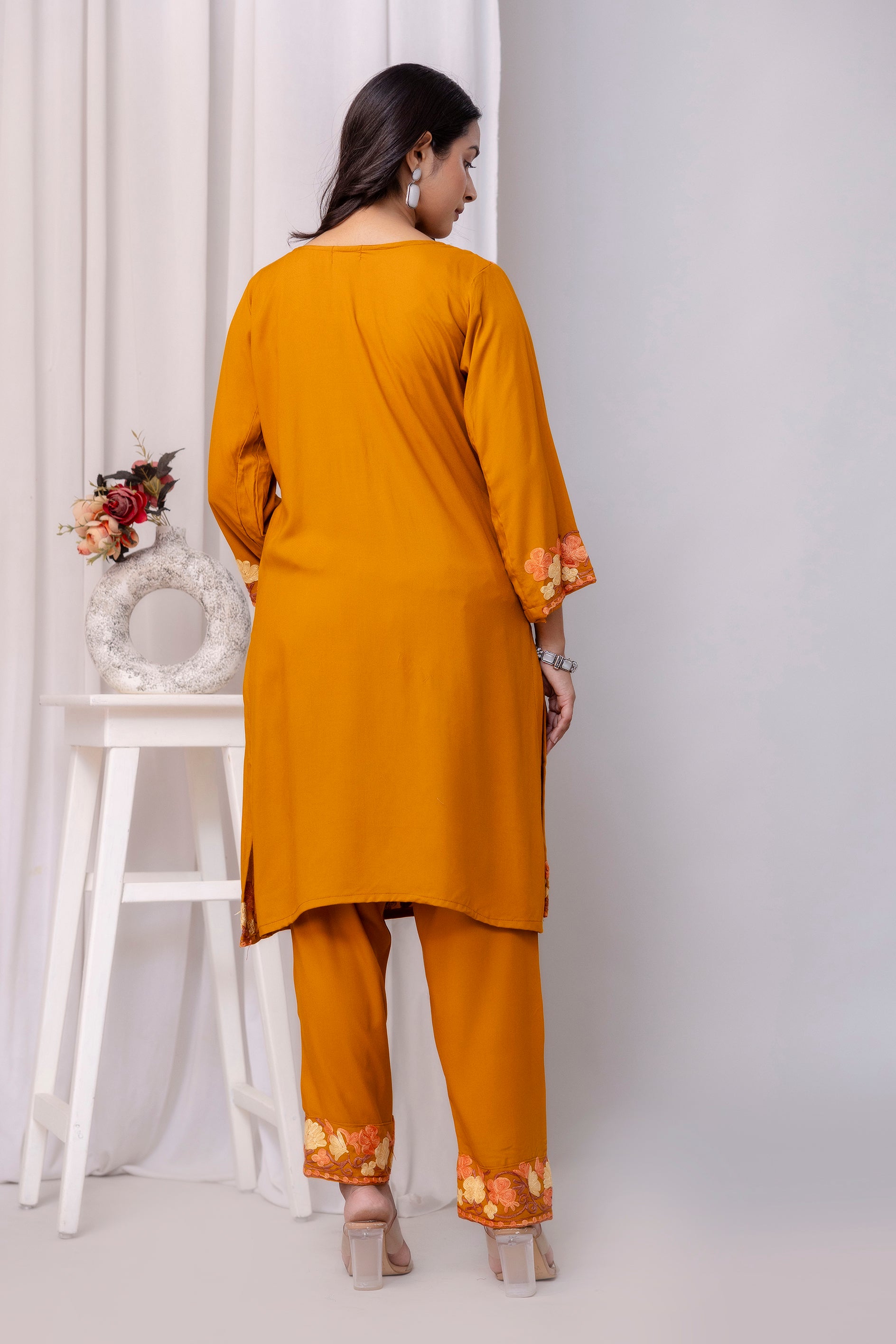 TOK Aari Embroidered Cotton Solid Women's 2PC Co-ord Set - Mustard