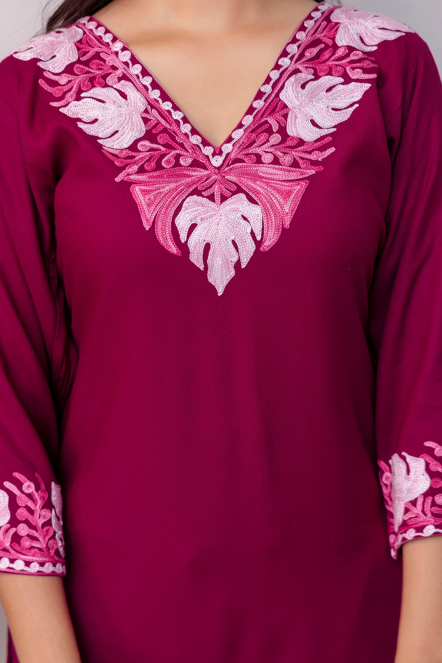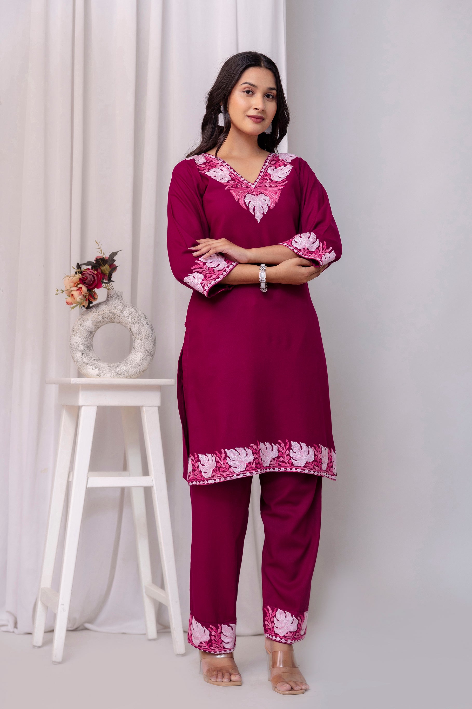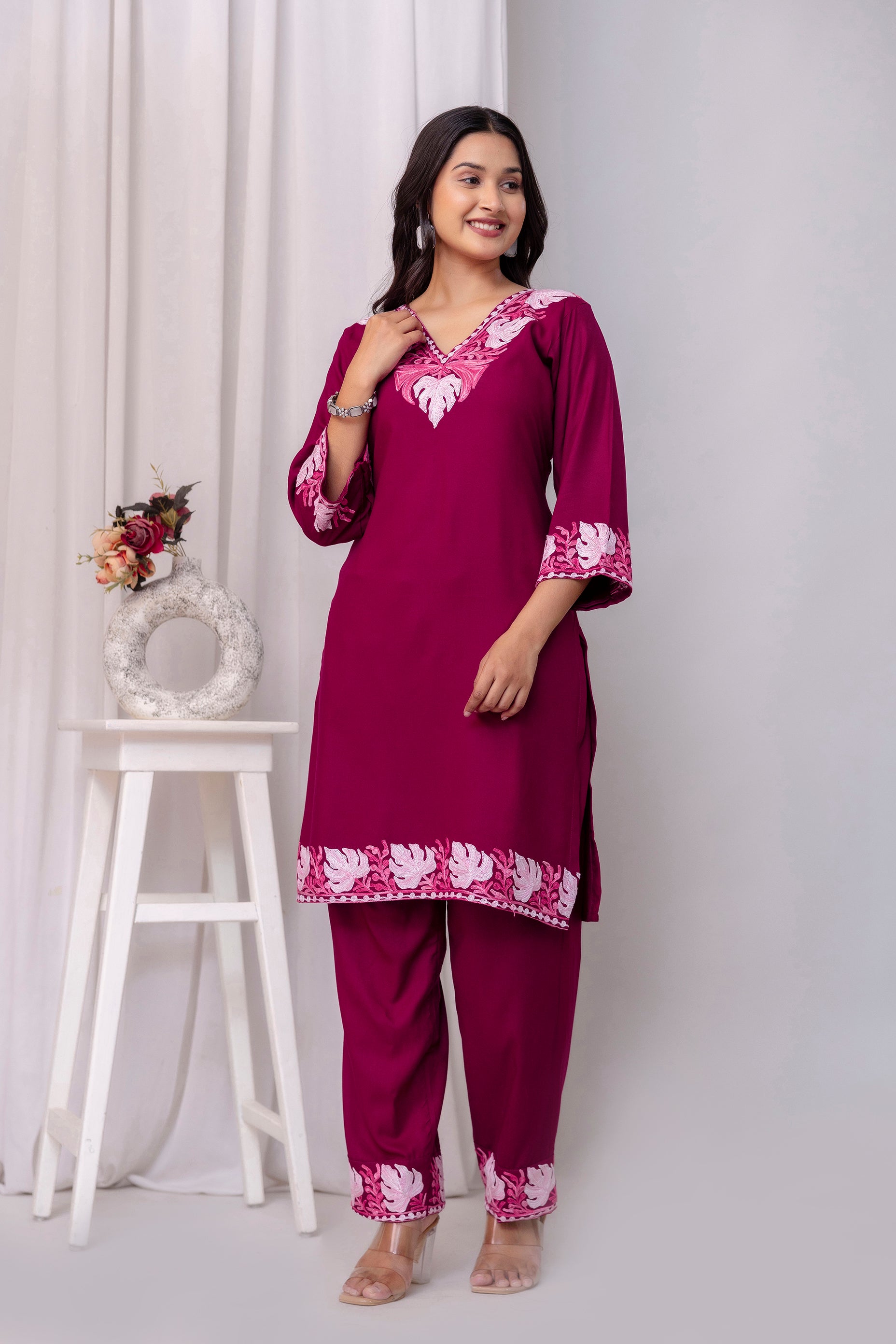 TOK Aari Embroidered Cotton Solid Women's 2PC Co-ord Set - Magenta