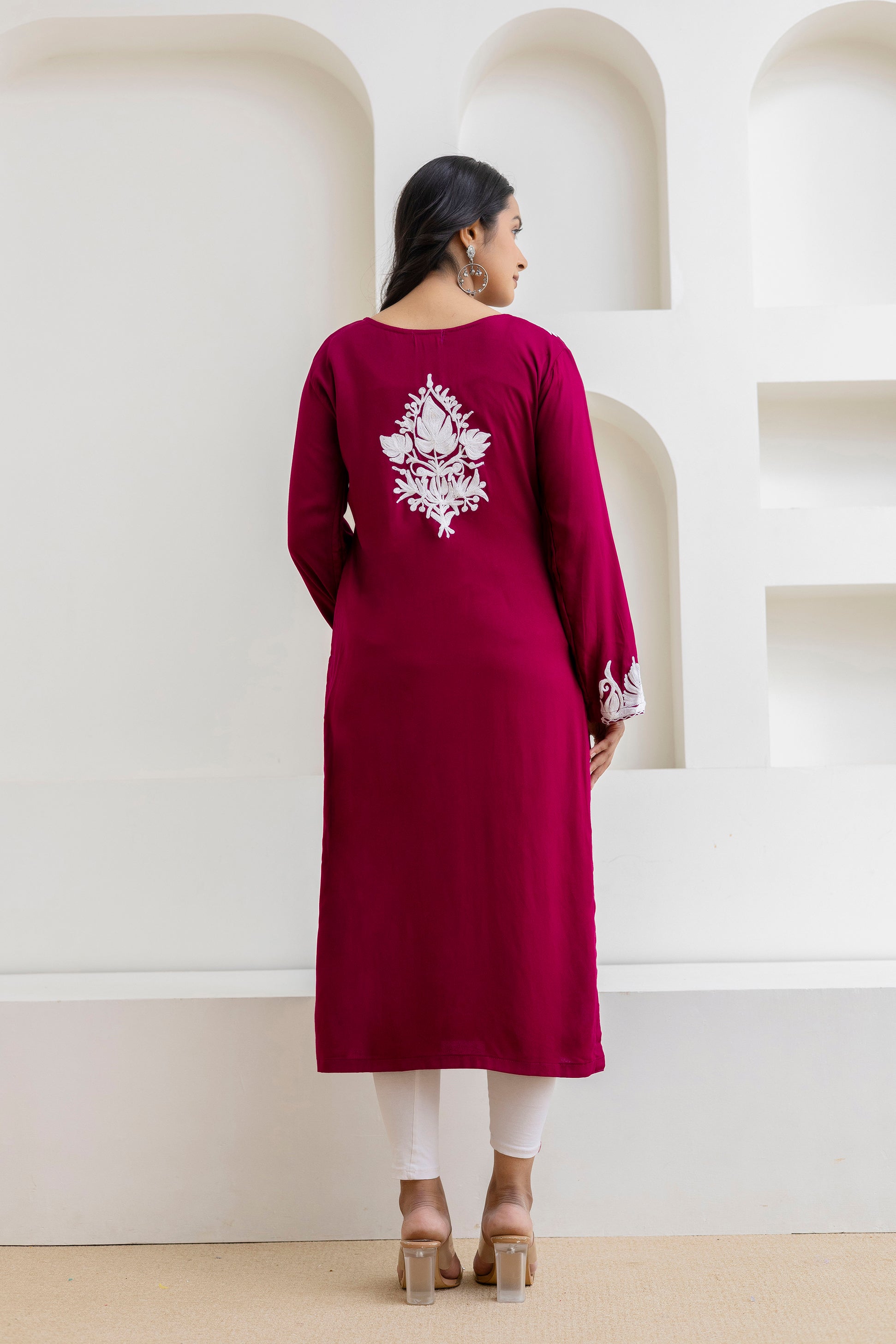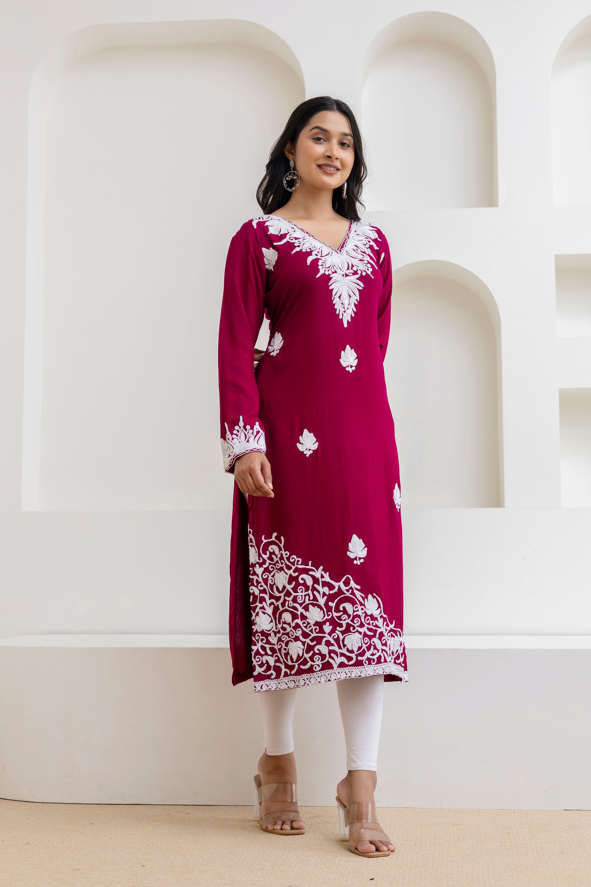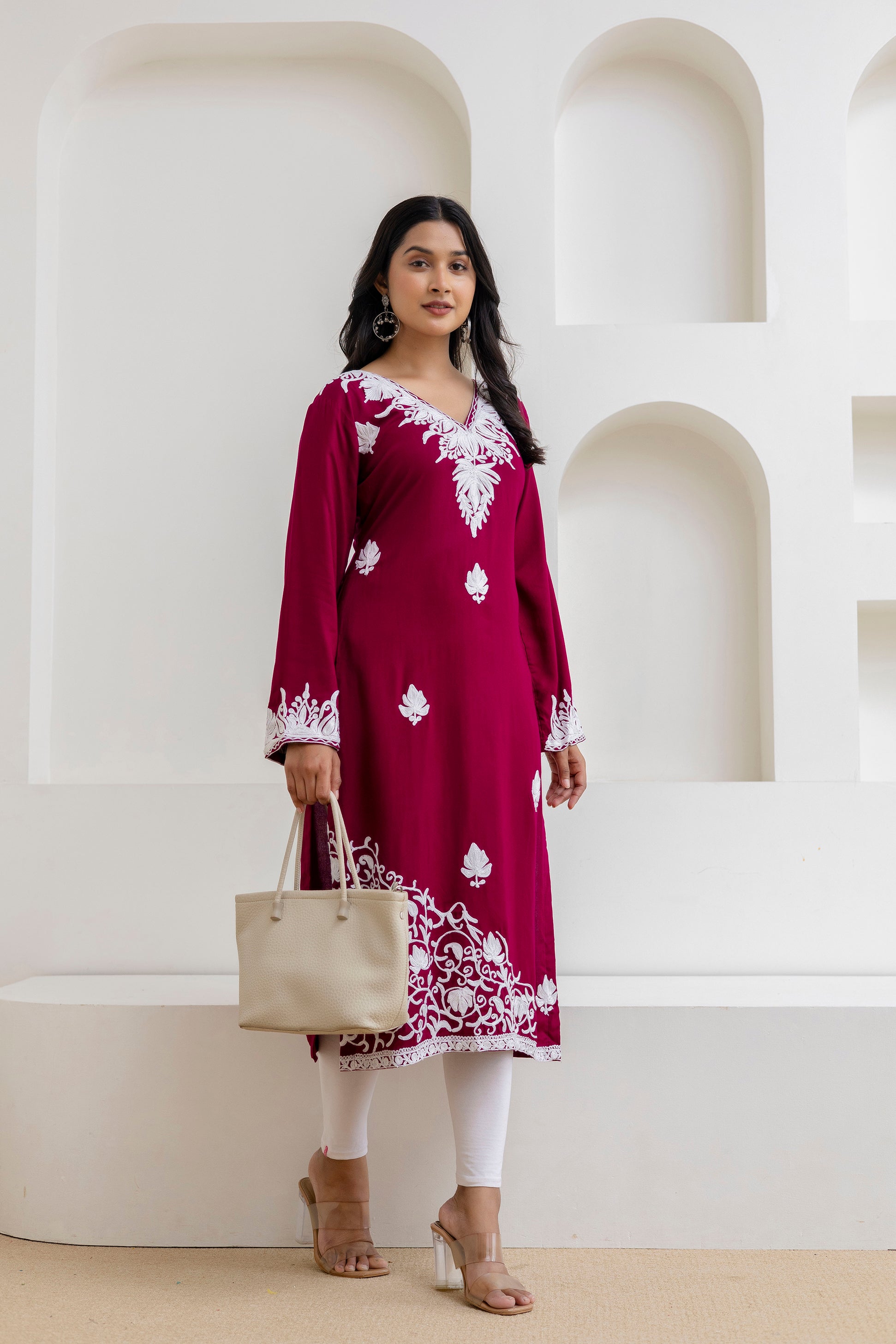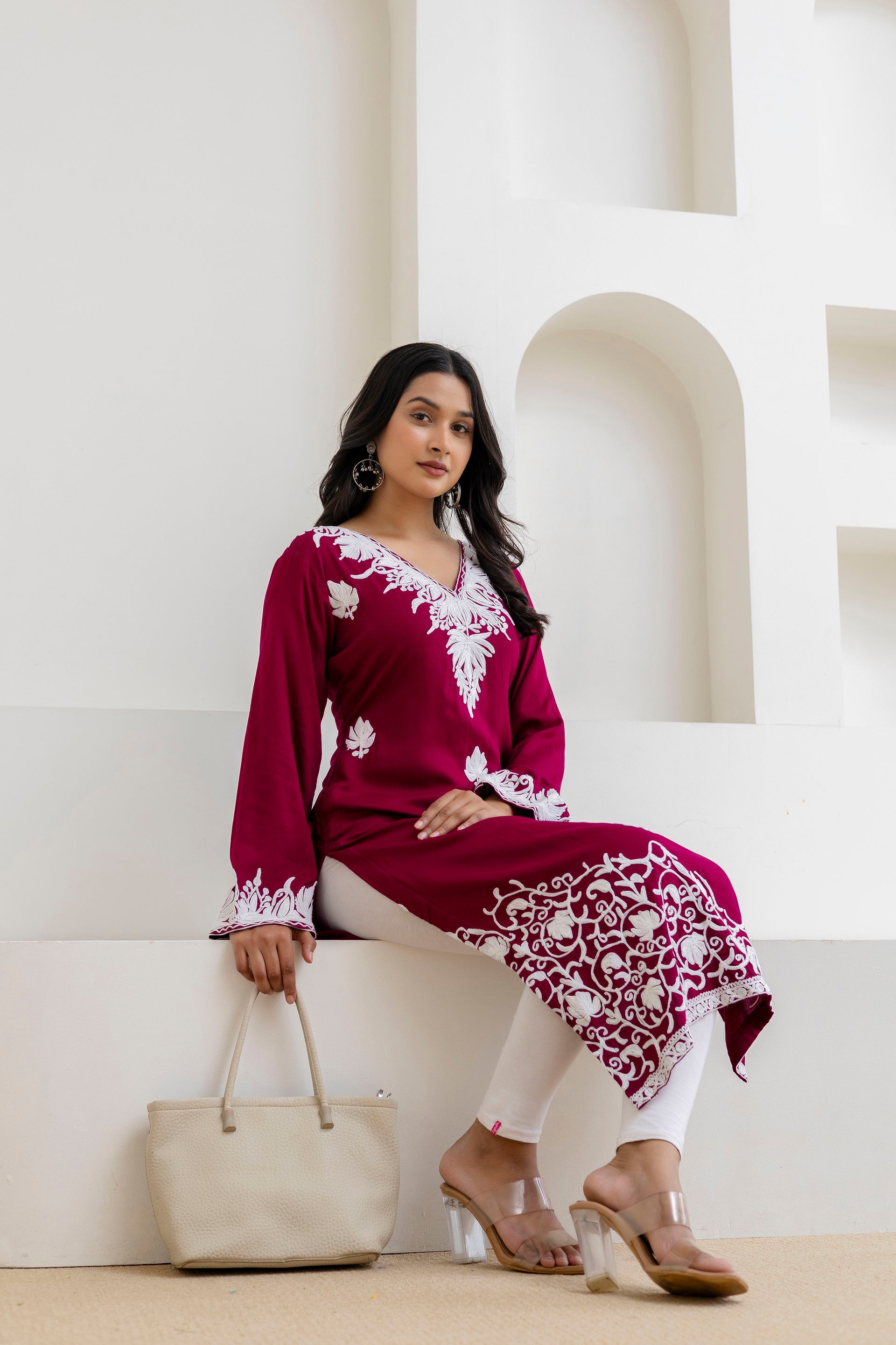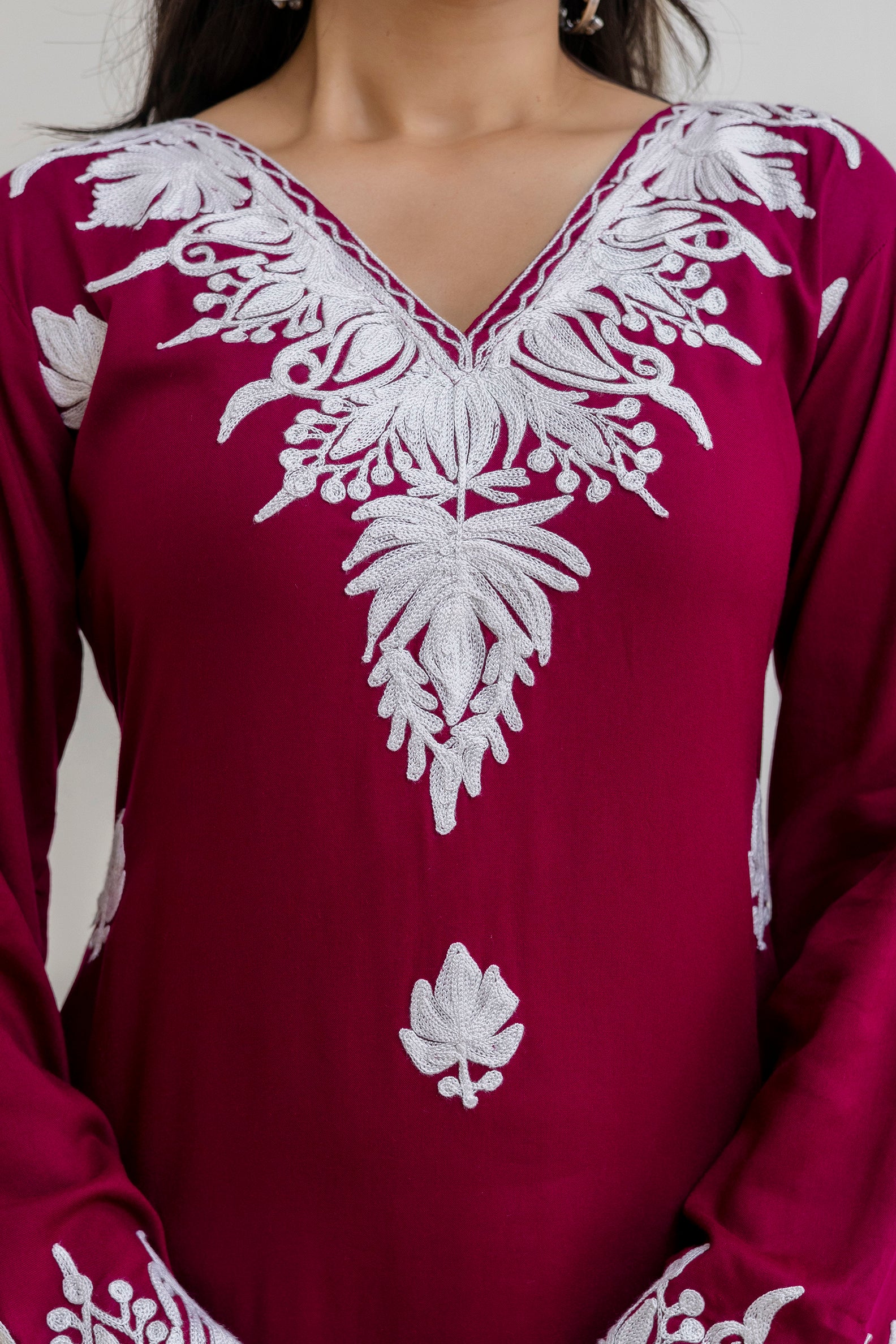 TOK Aari Embroidered Cotton Solid Women's Long Kurta - Magenta