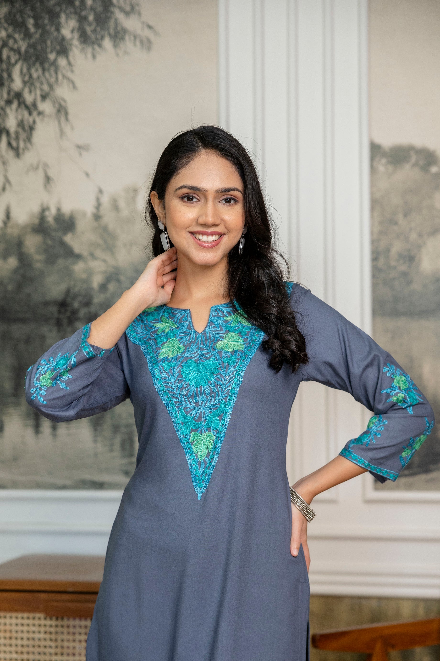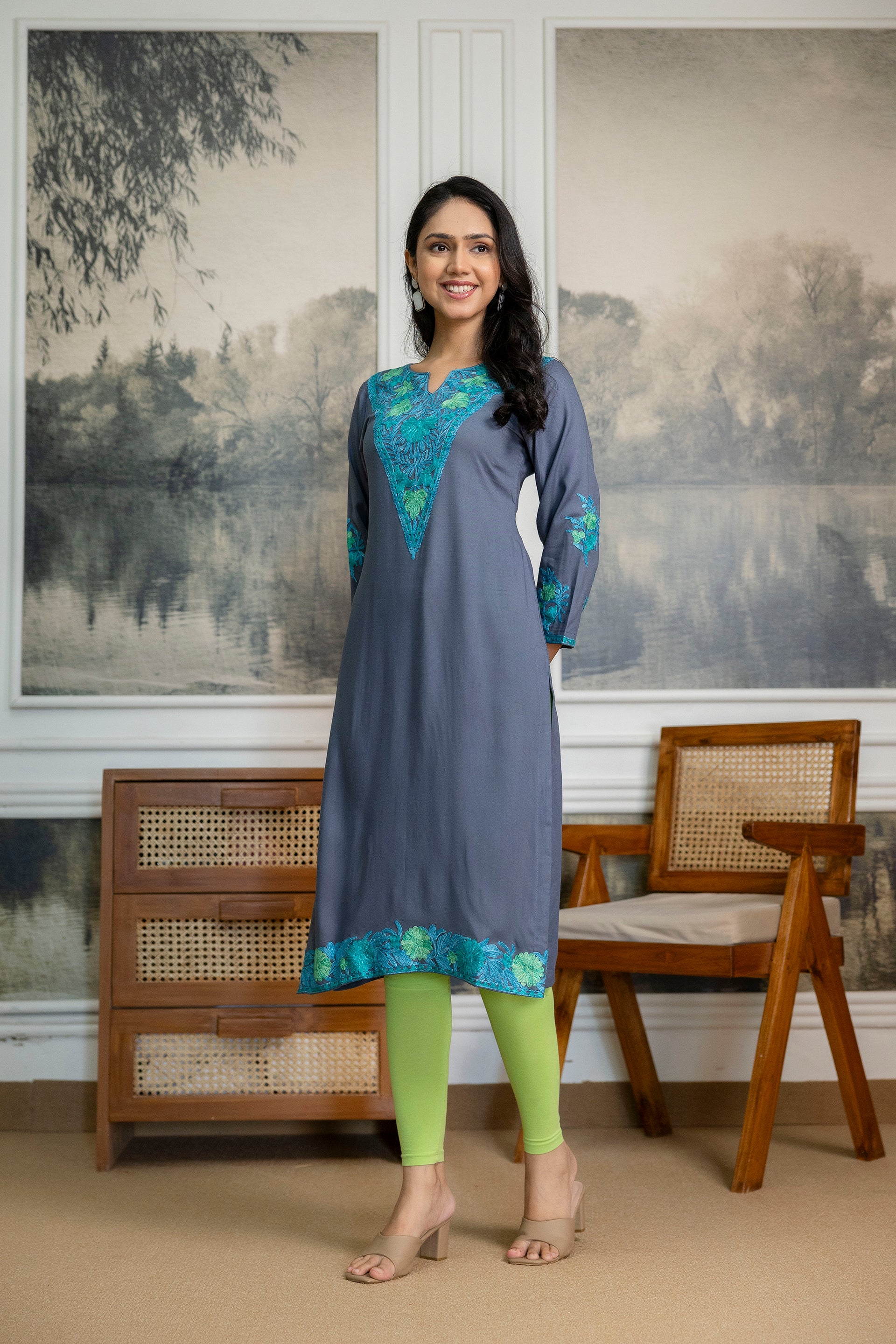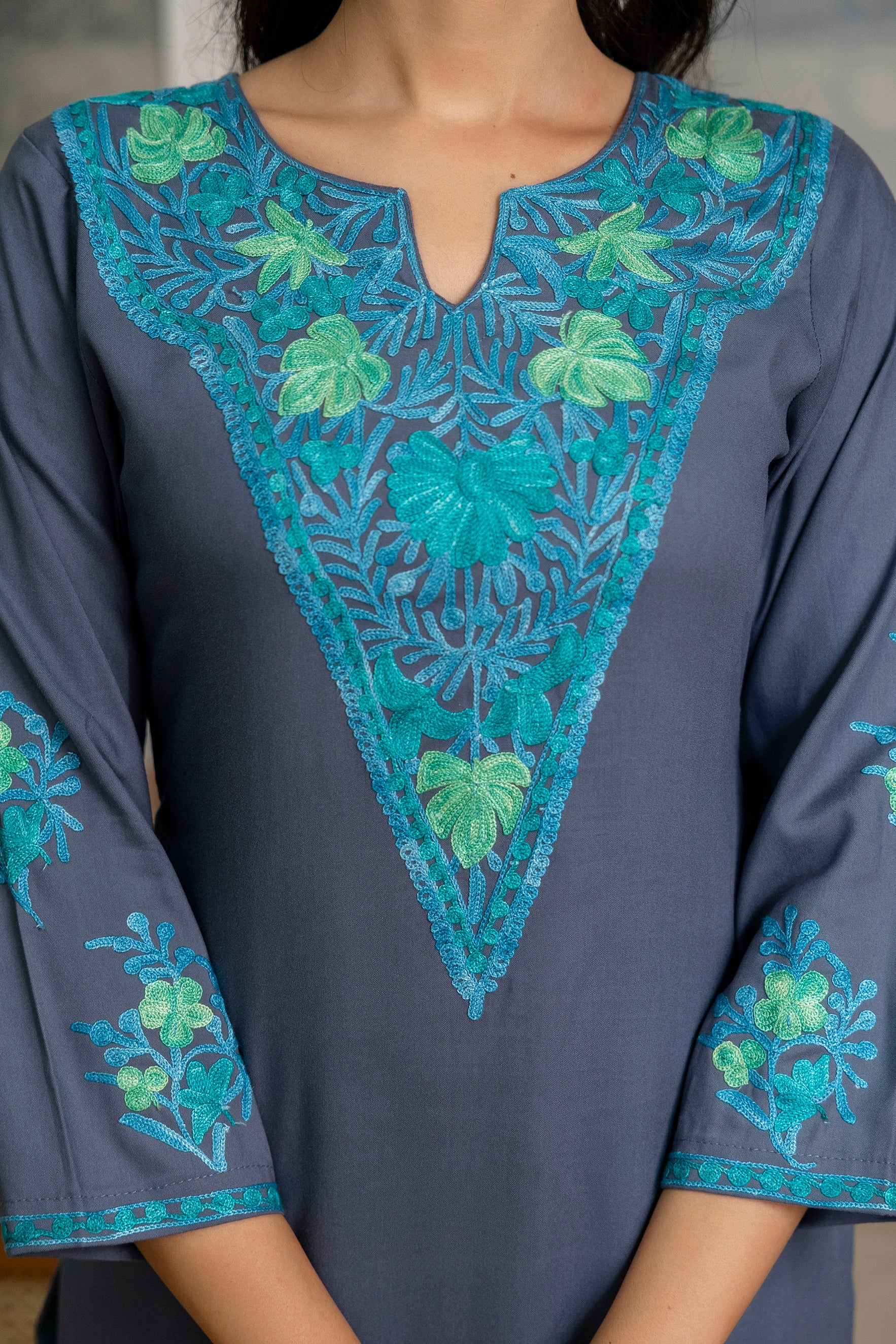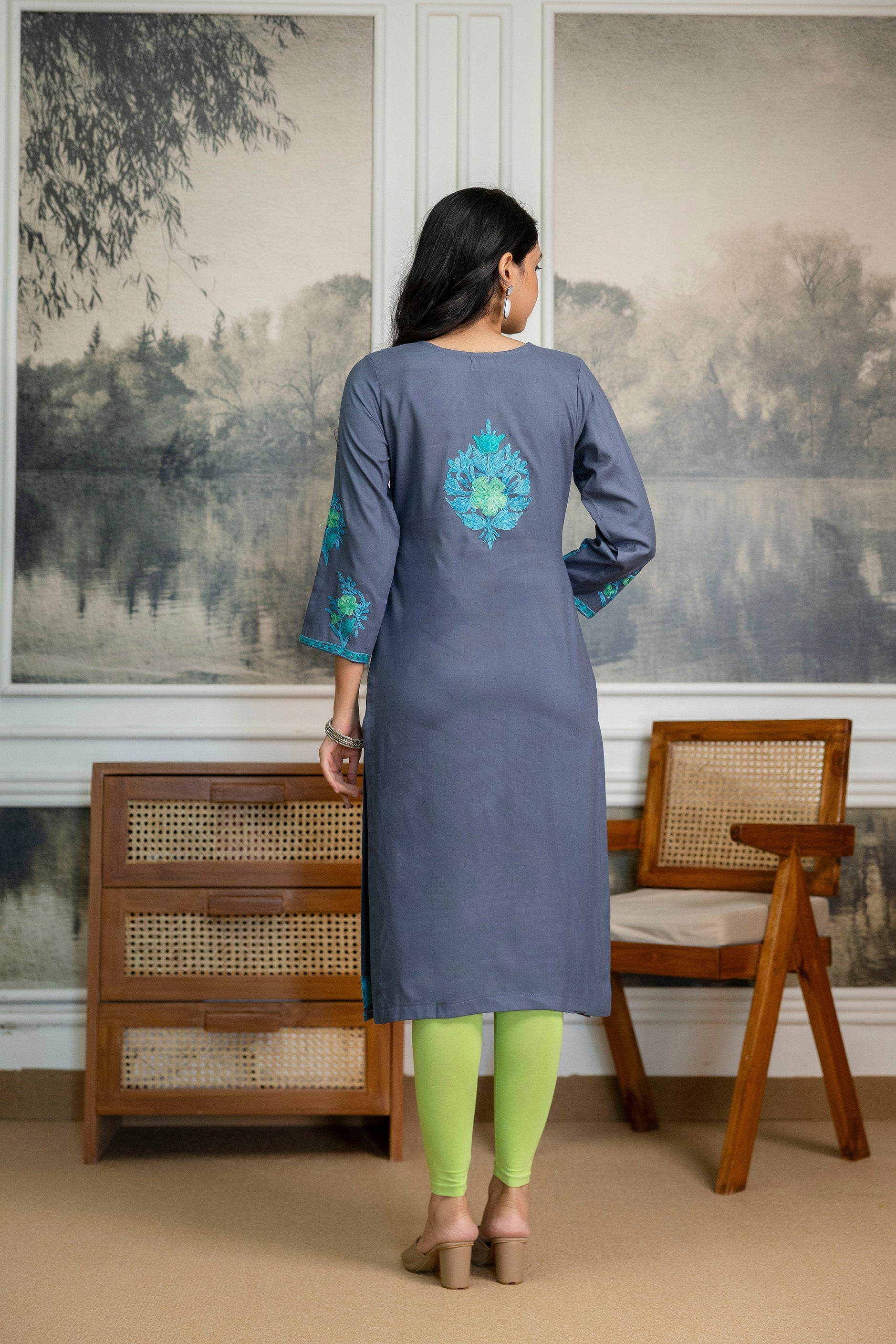 TOK Aari Embroidered Cotton Solid Women's Long Kurta - Grey