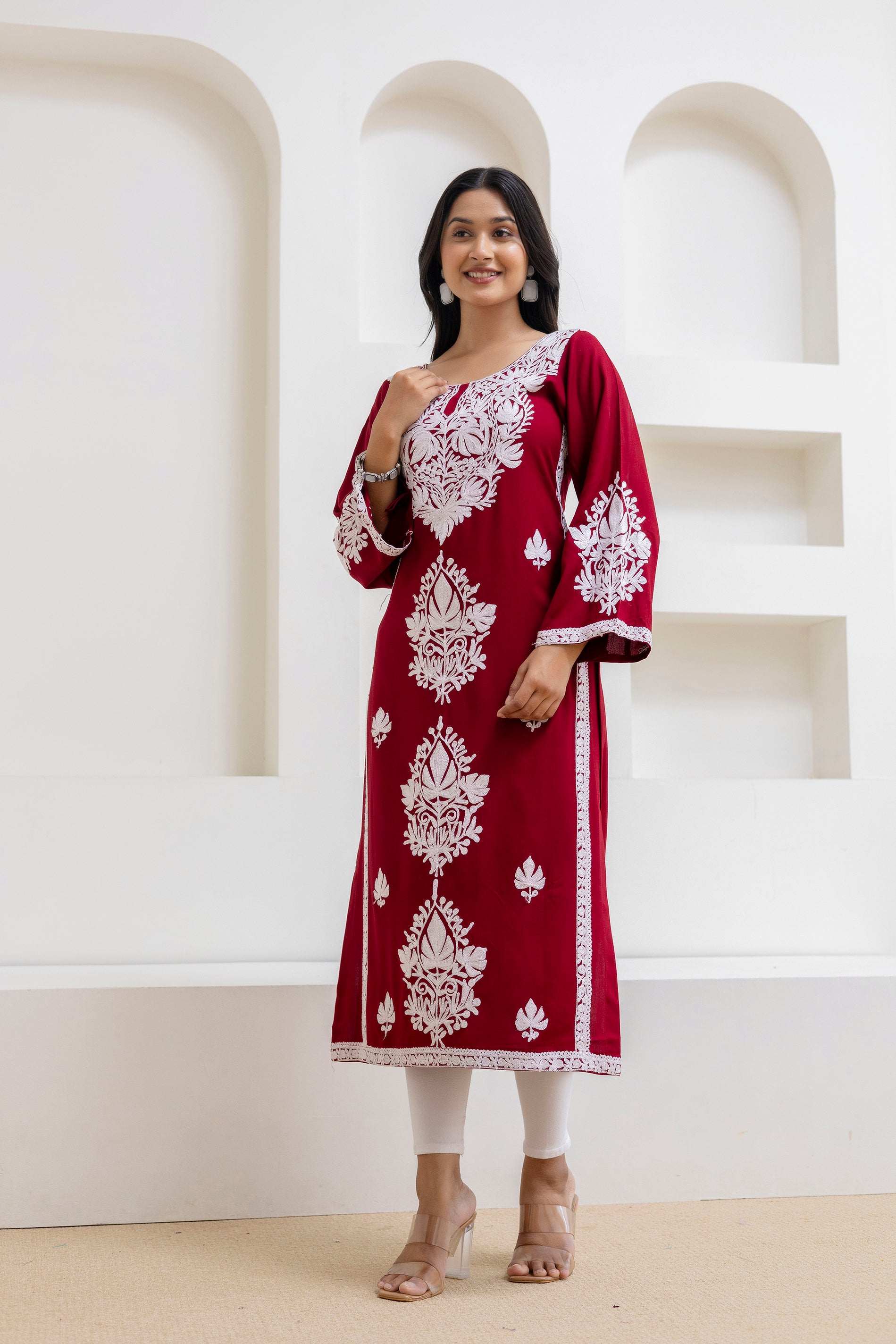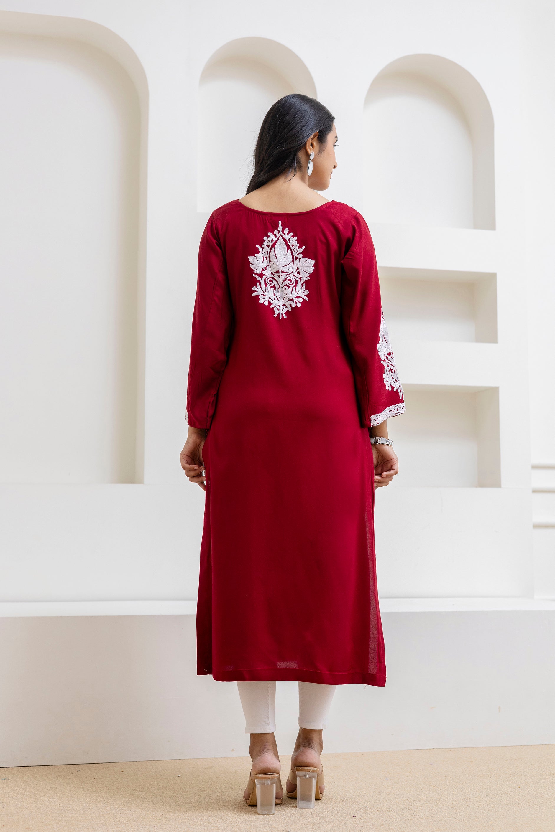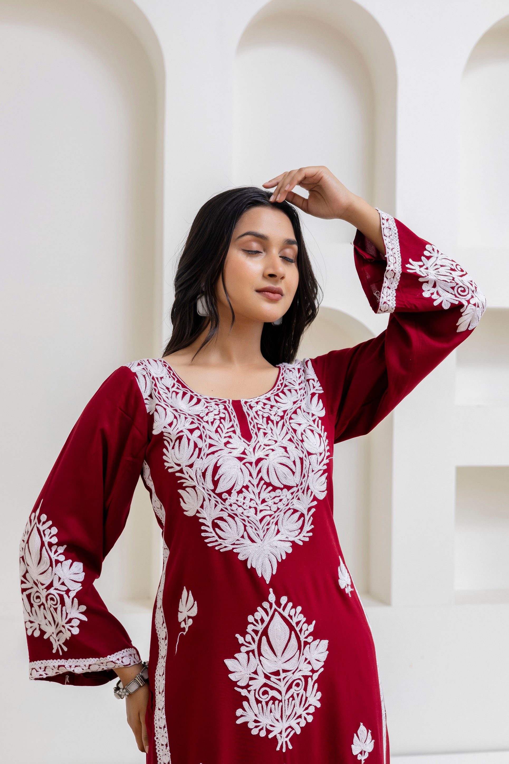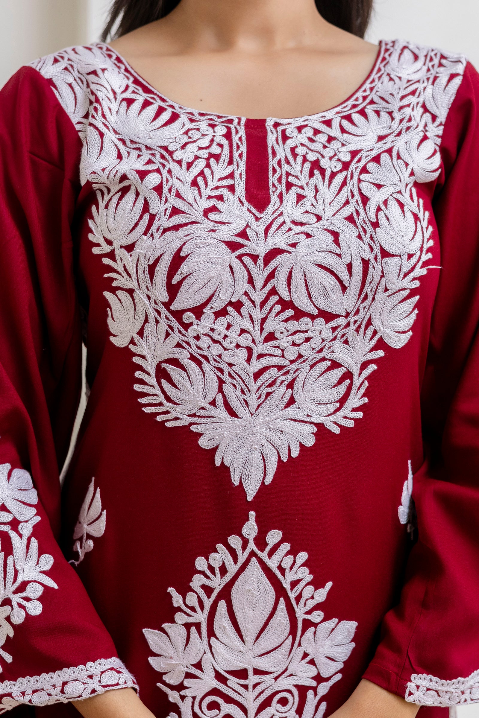 TOK Aari Embroidered Cotton Solid Women's Long Kurta - Maroon