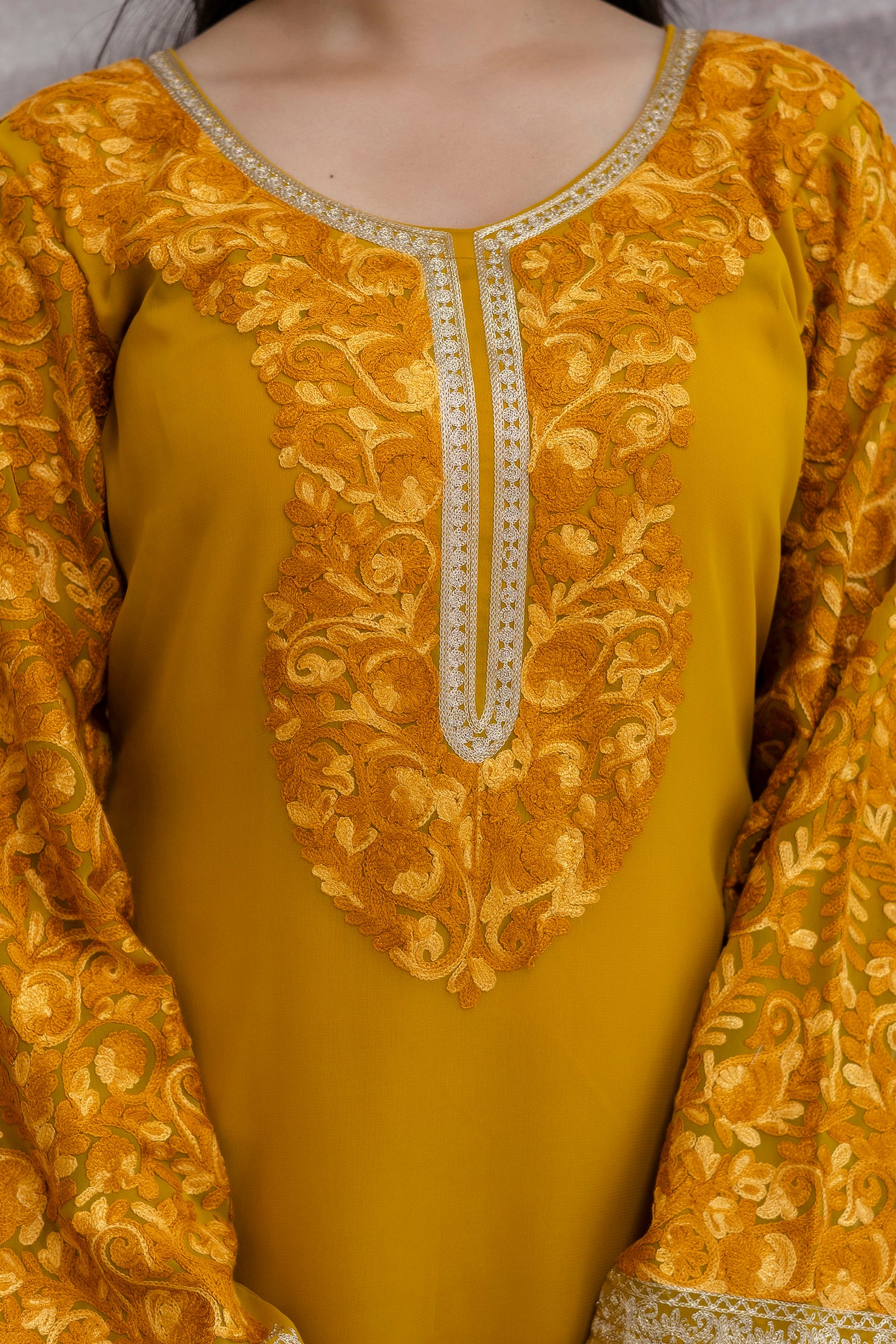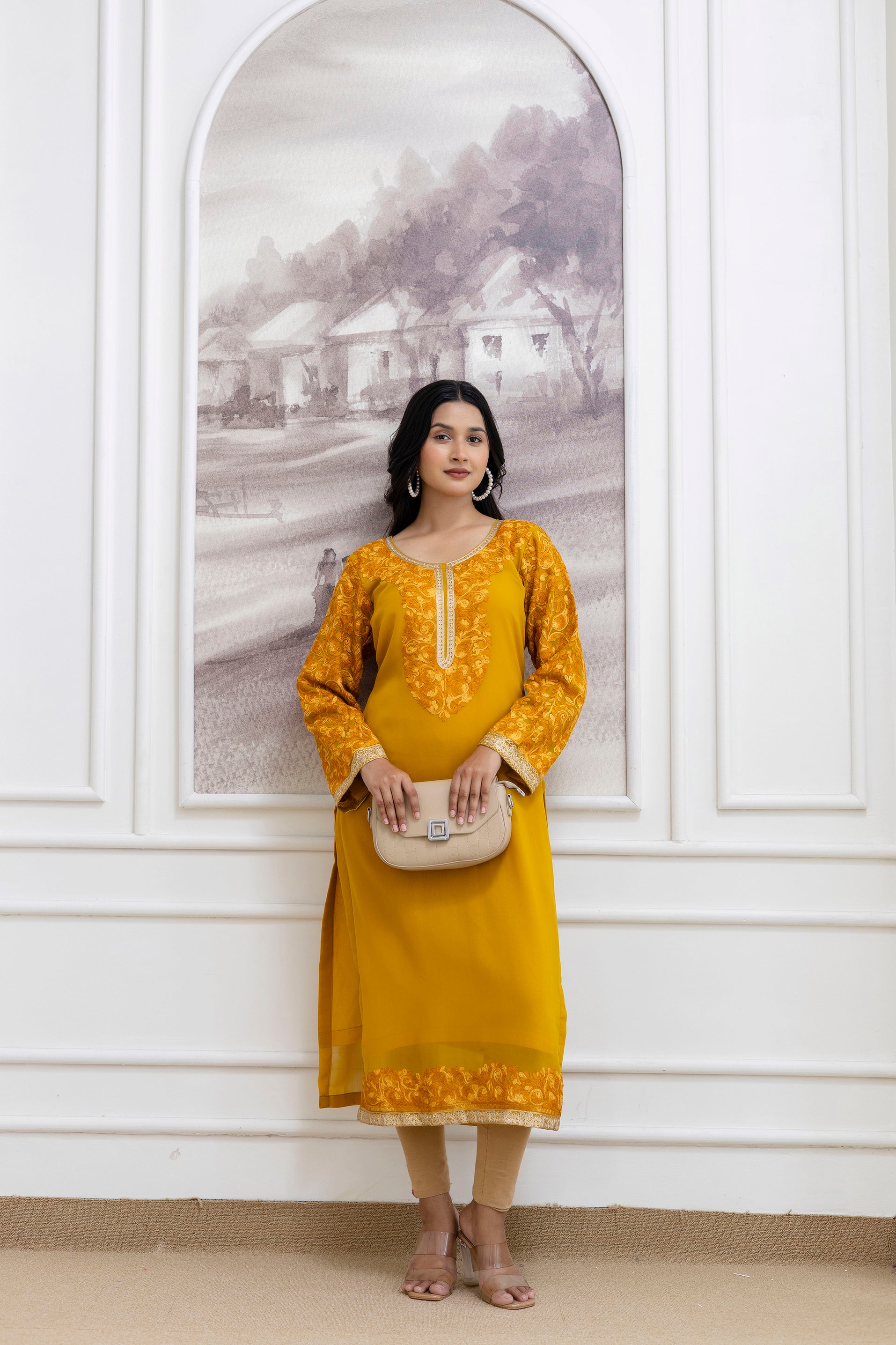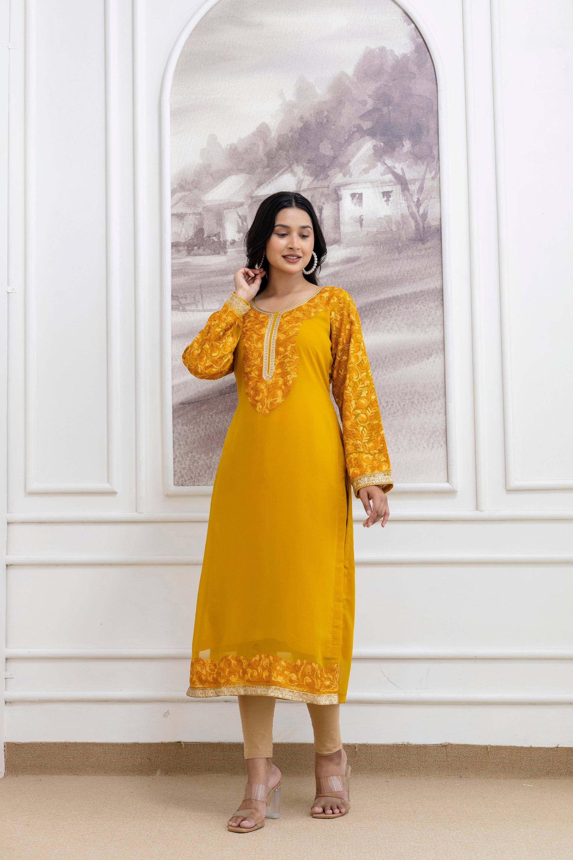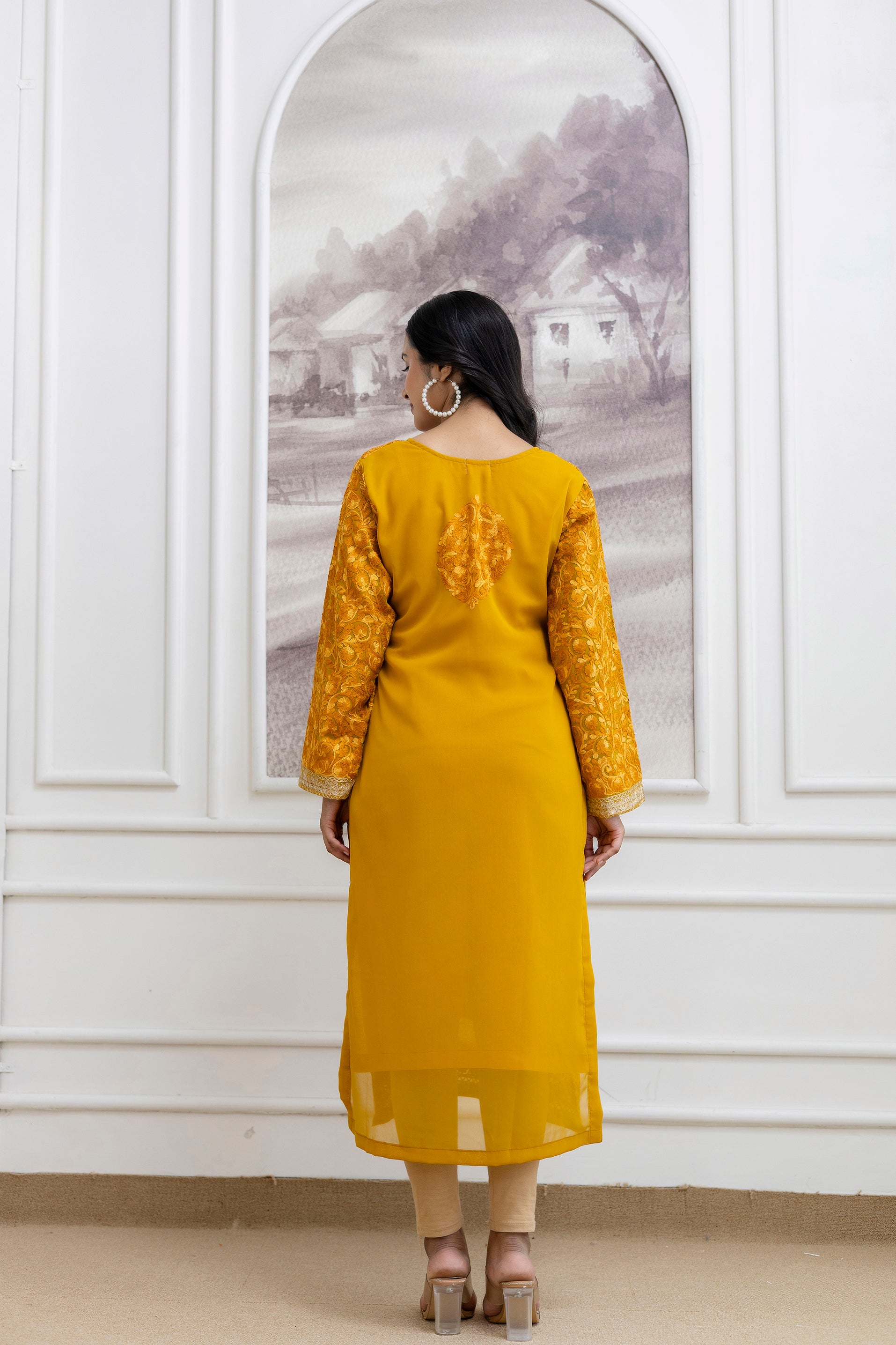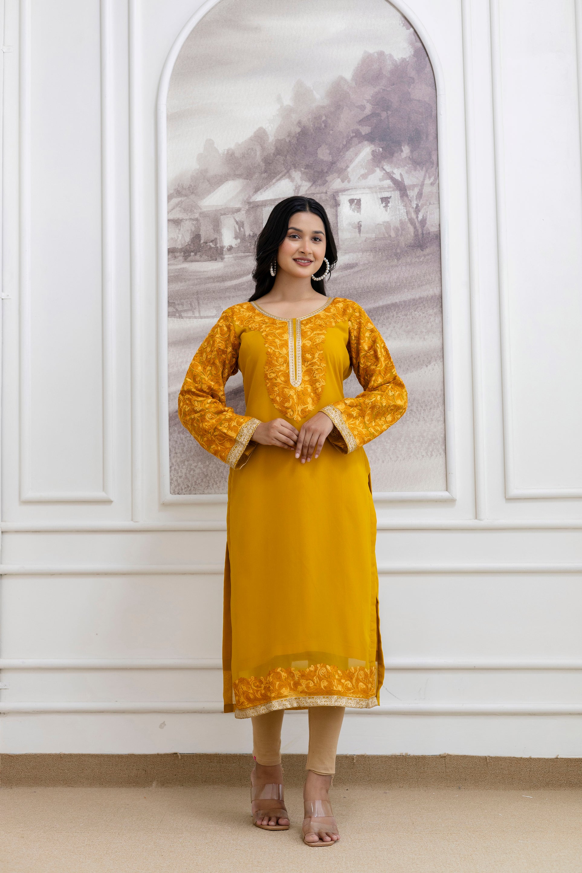 TOK Aari Embroidered Georgette Women's Long Kurta - Mustard