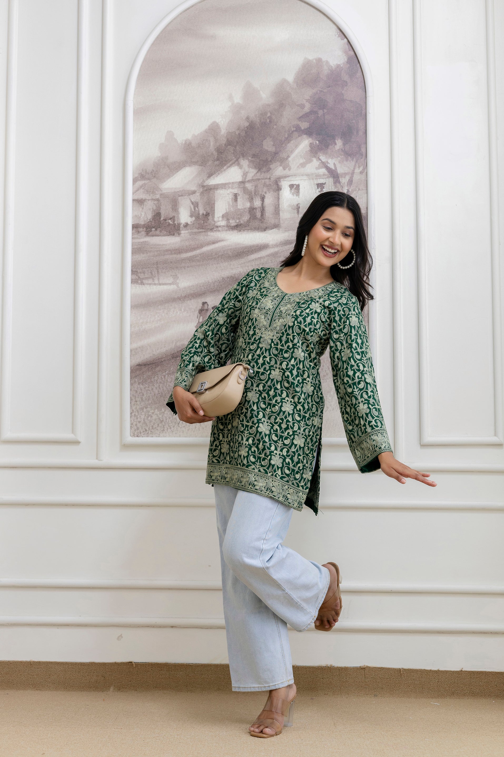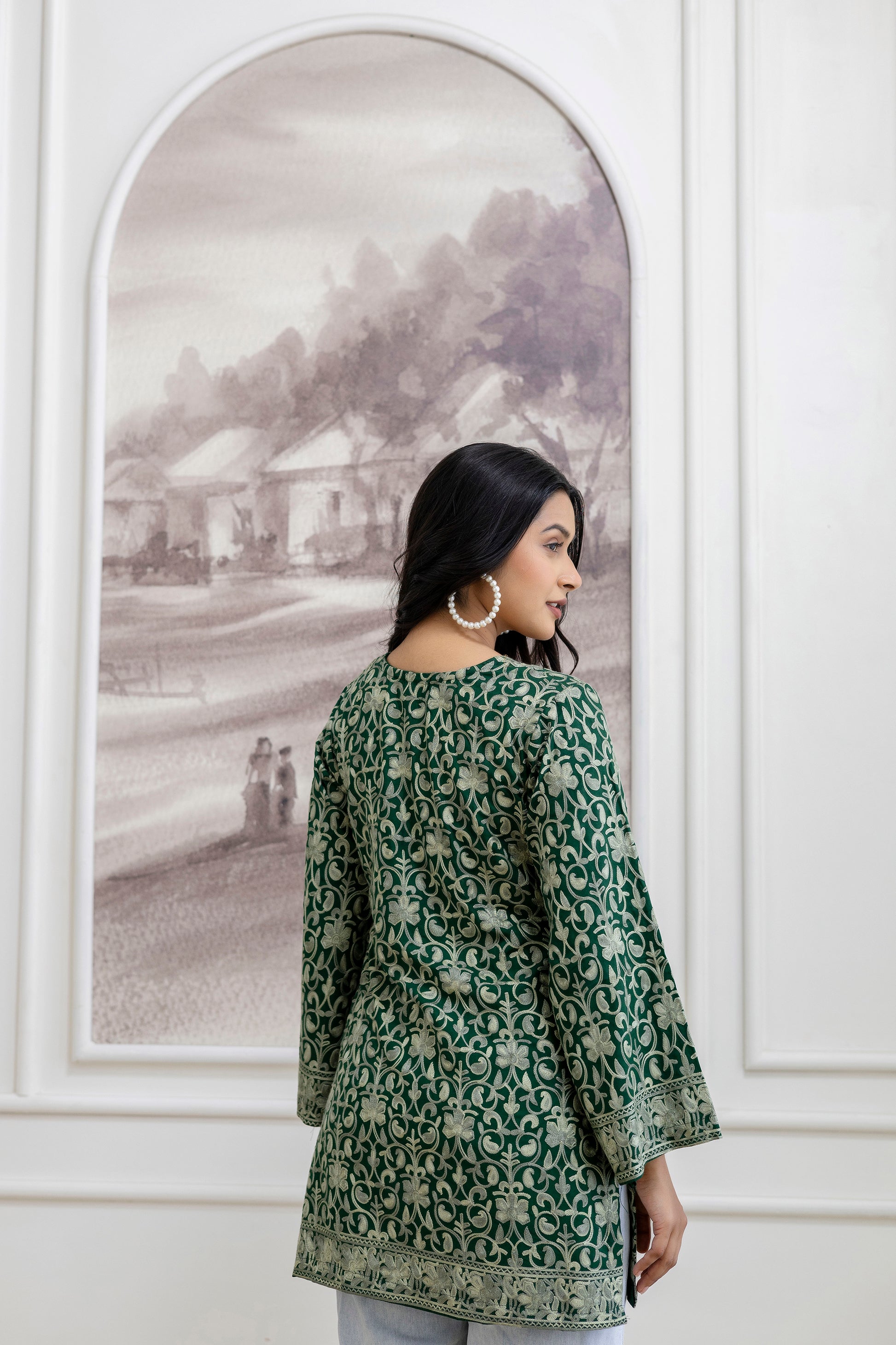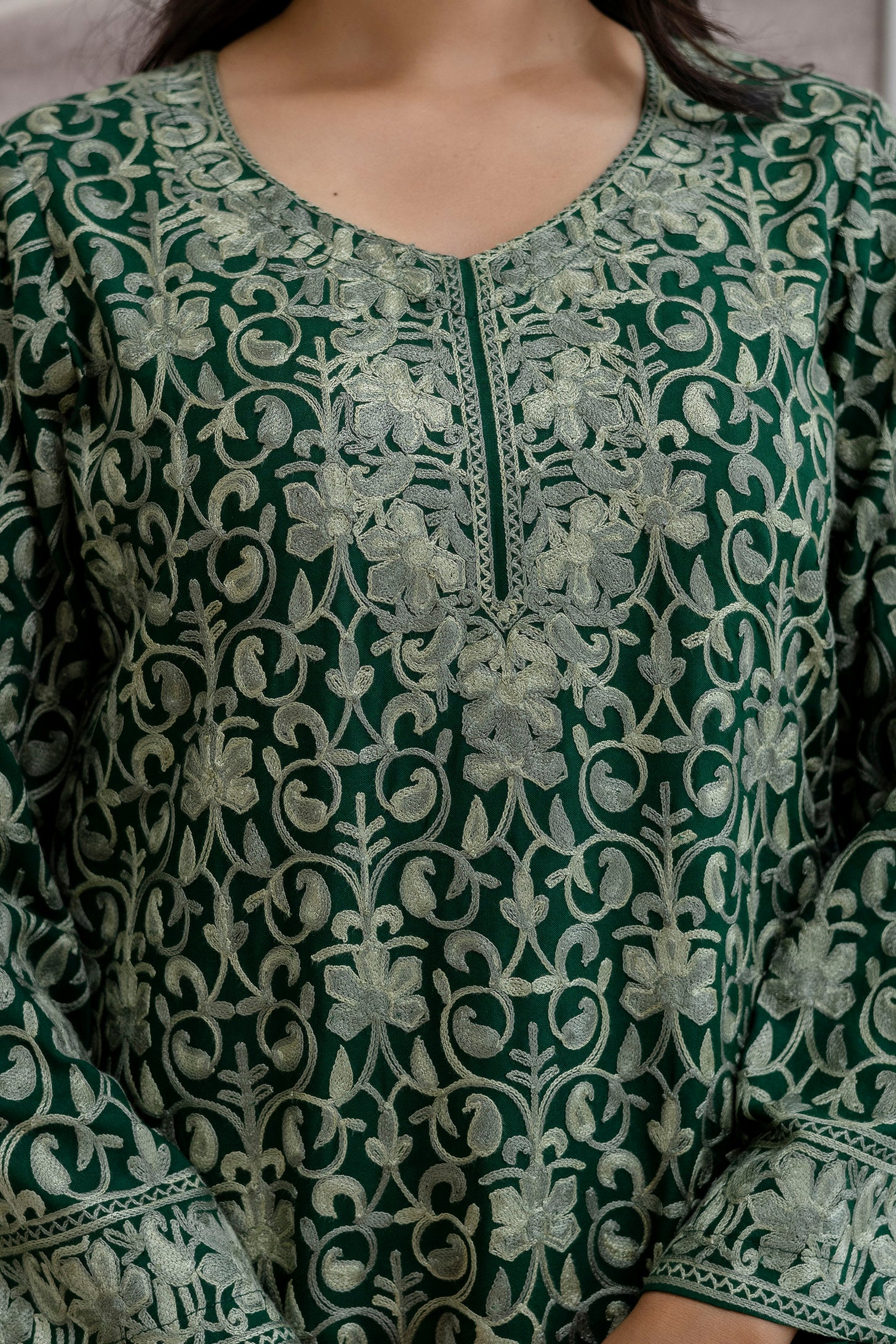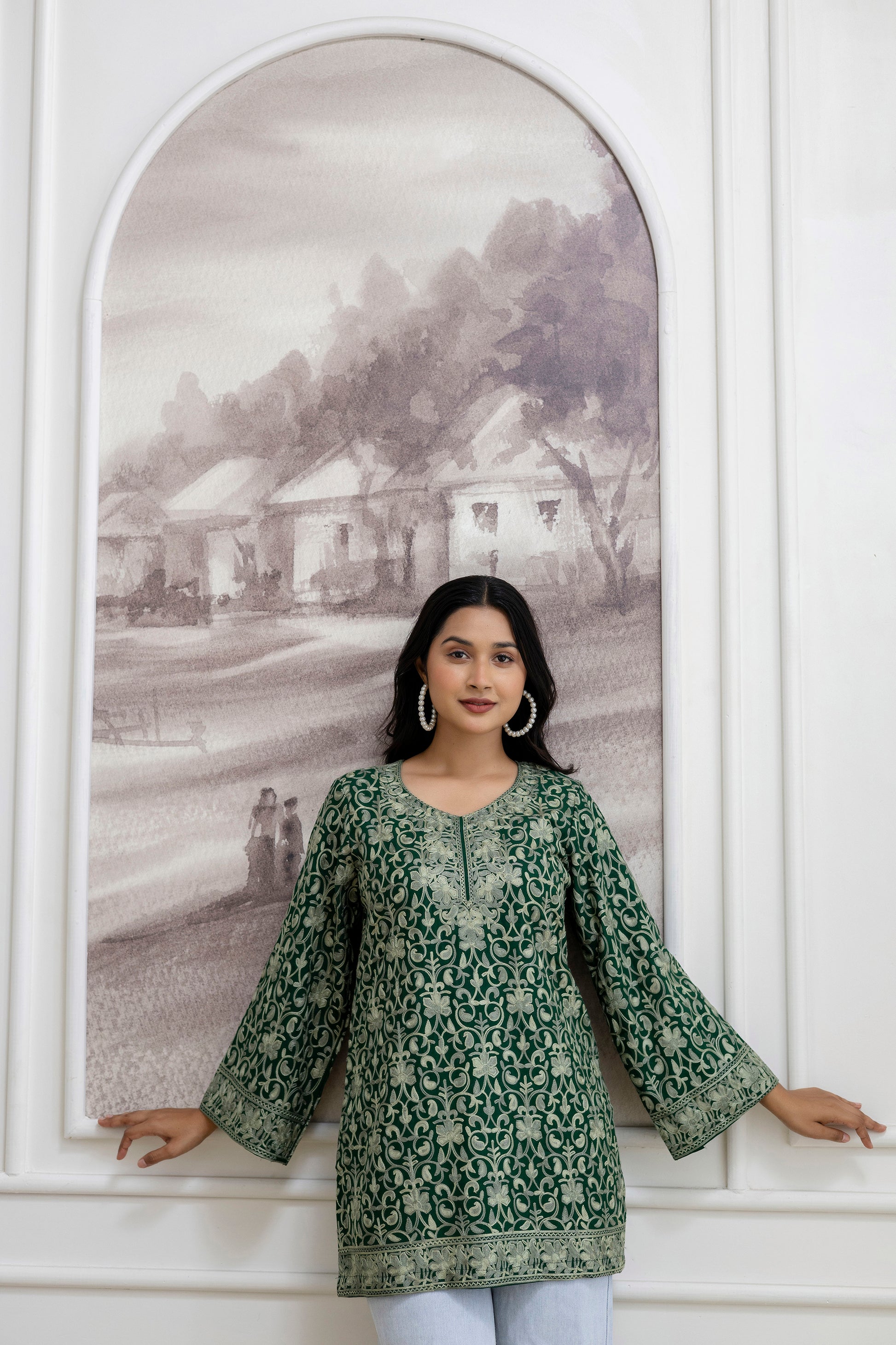 TOK Aari Embroidered Cotton Solid Women's Short Kurta - Dark Green