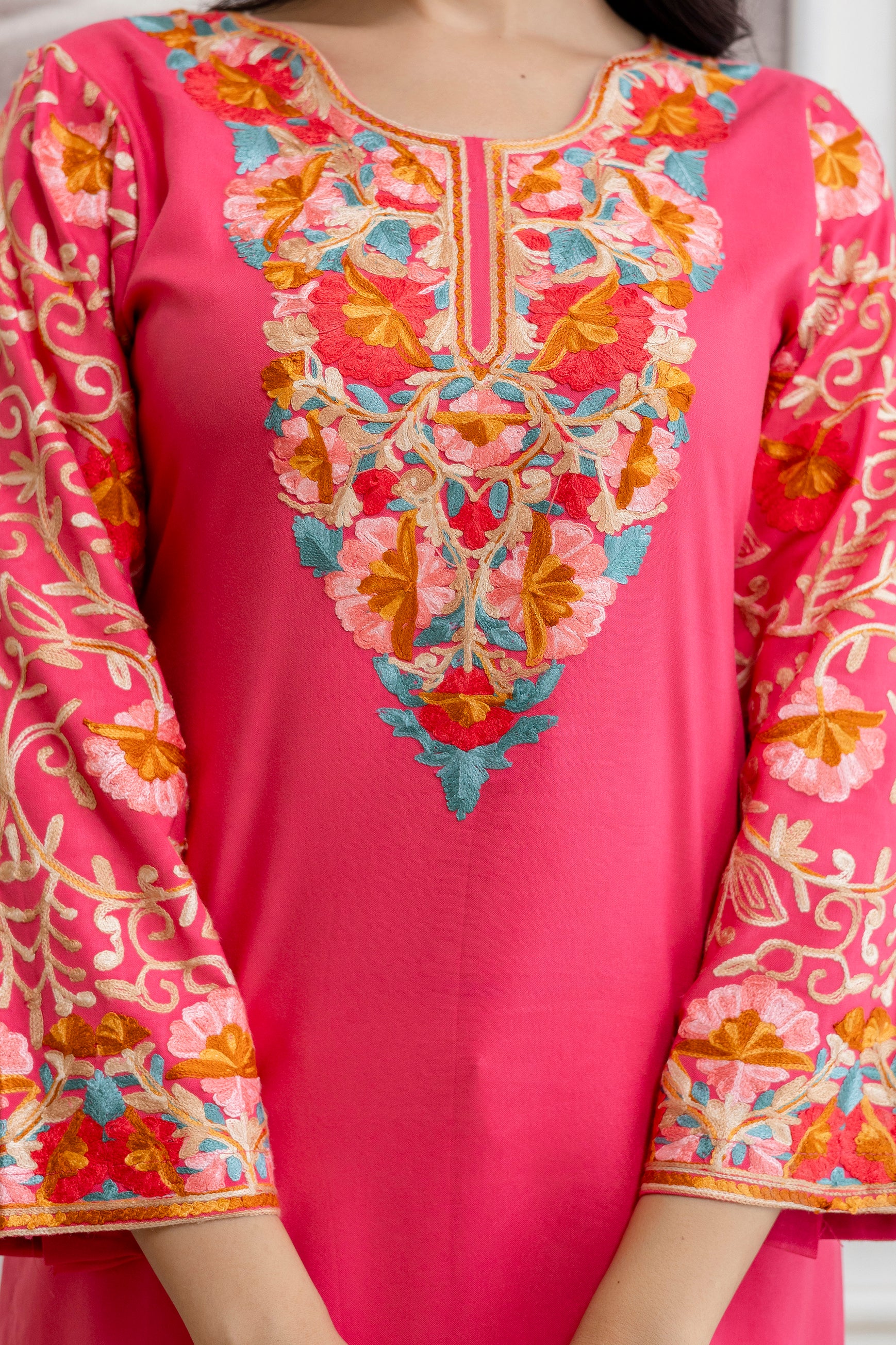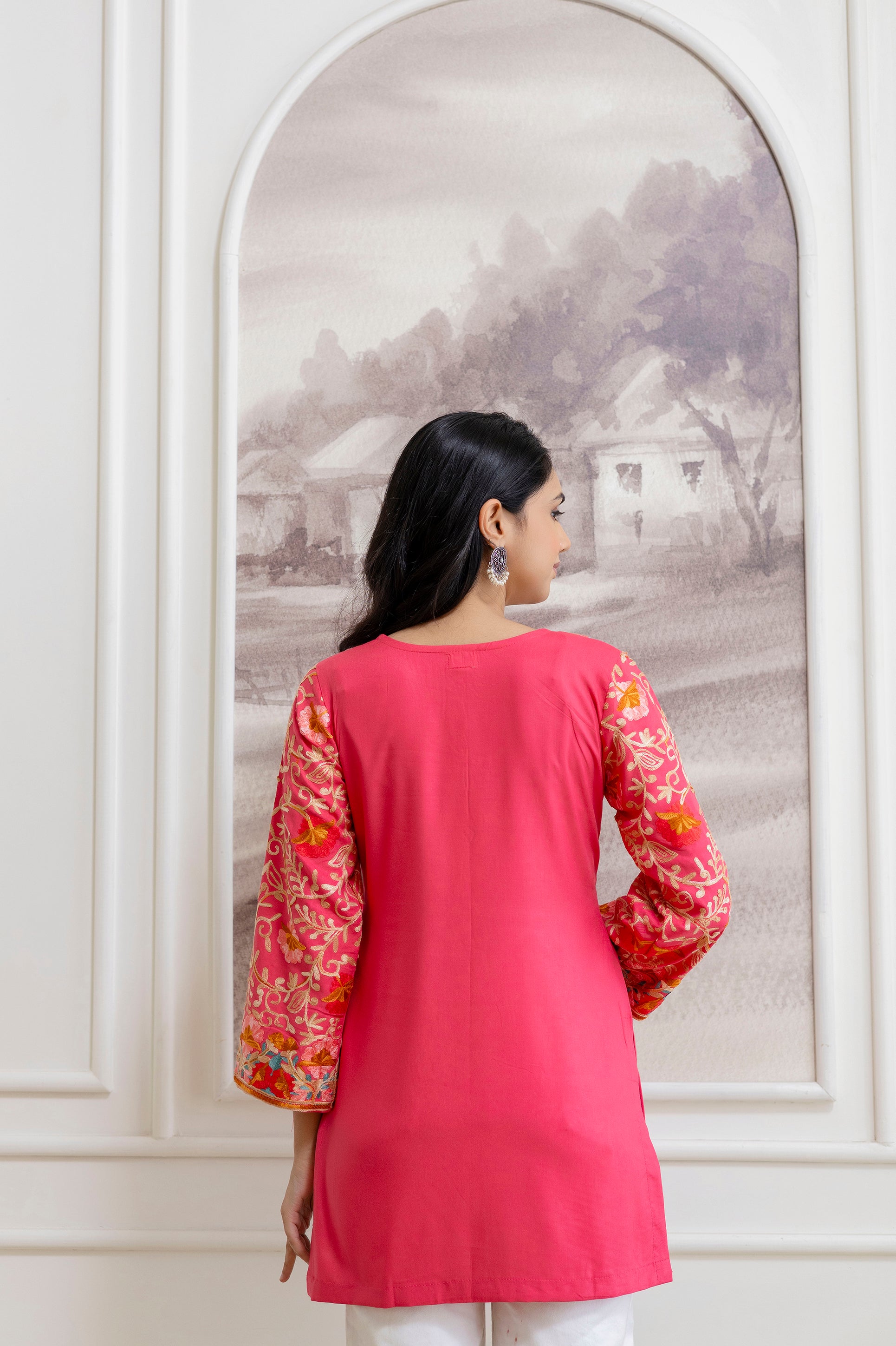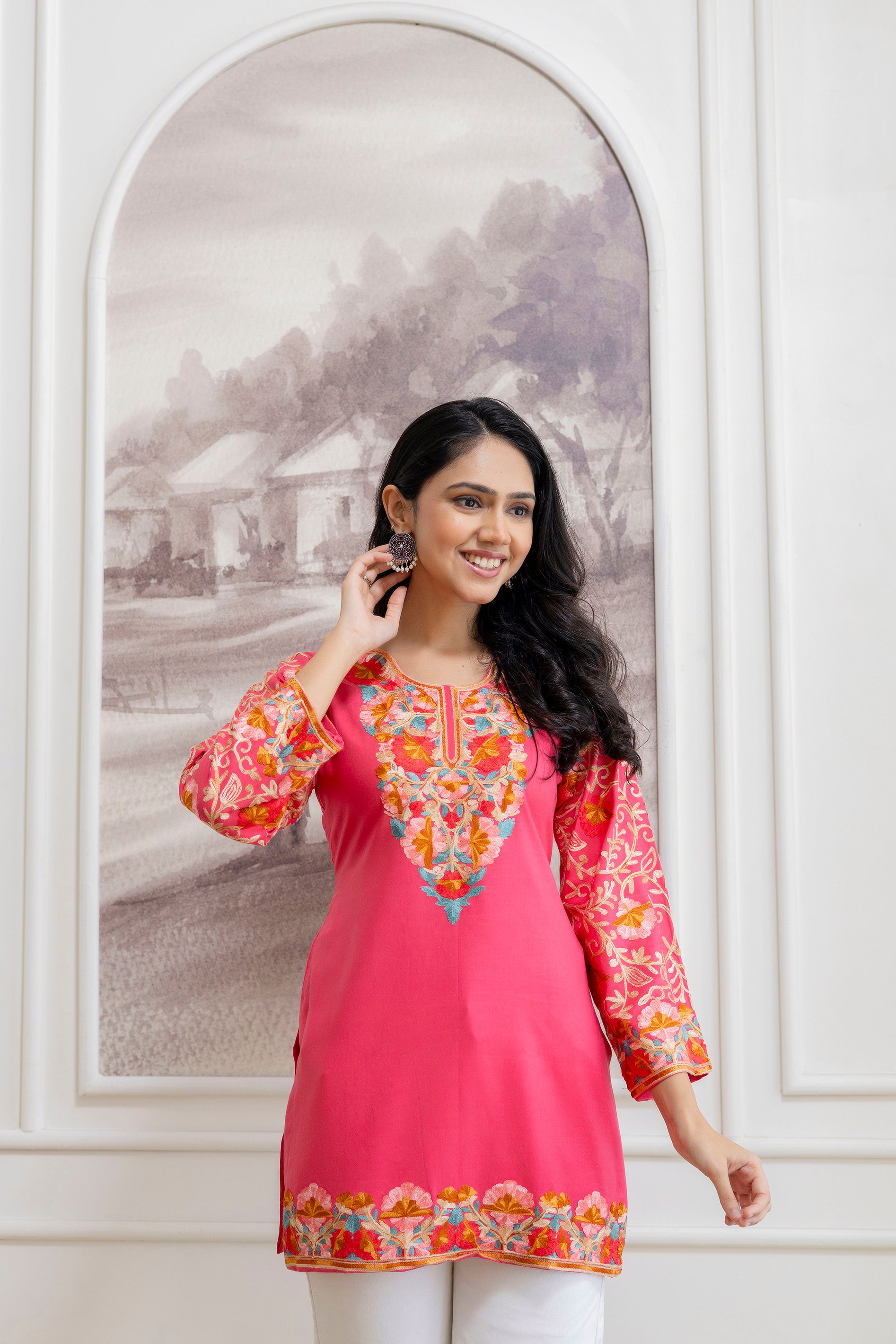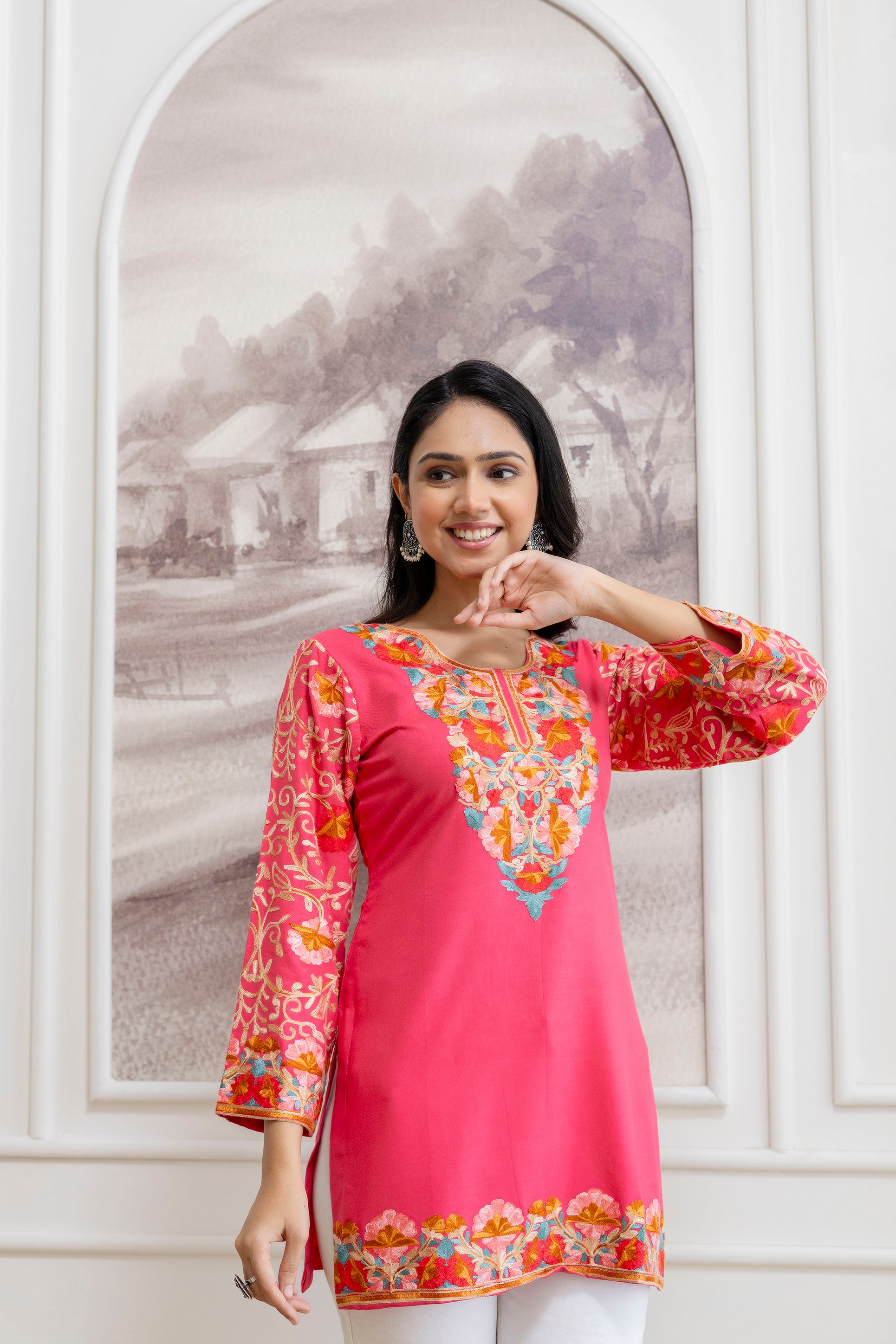 TOK Aari Embroidered Cotton Solid Women's Short Kurta - Pink