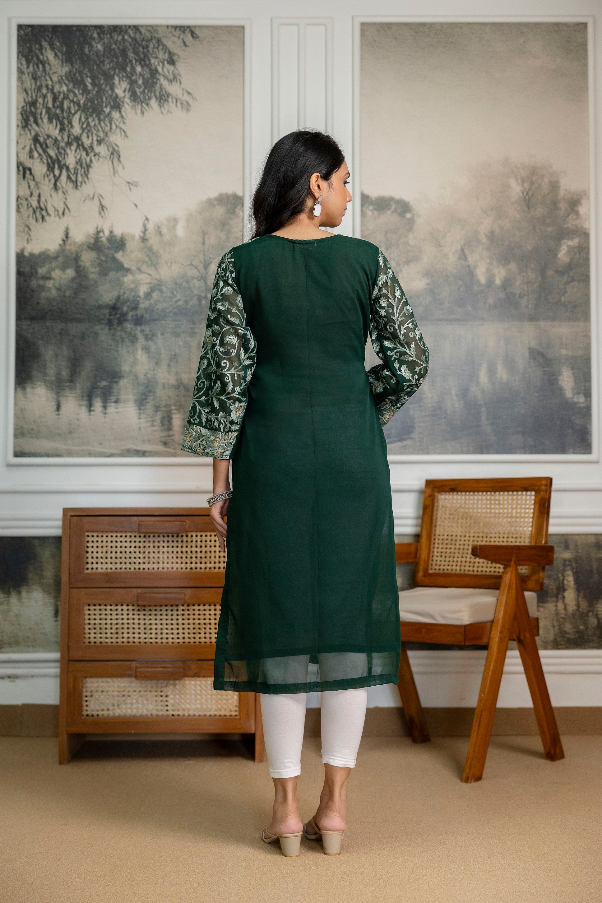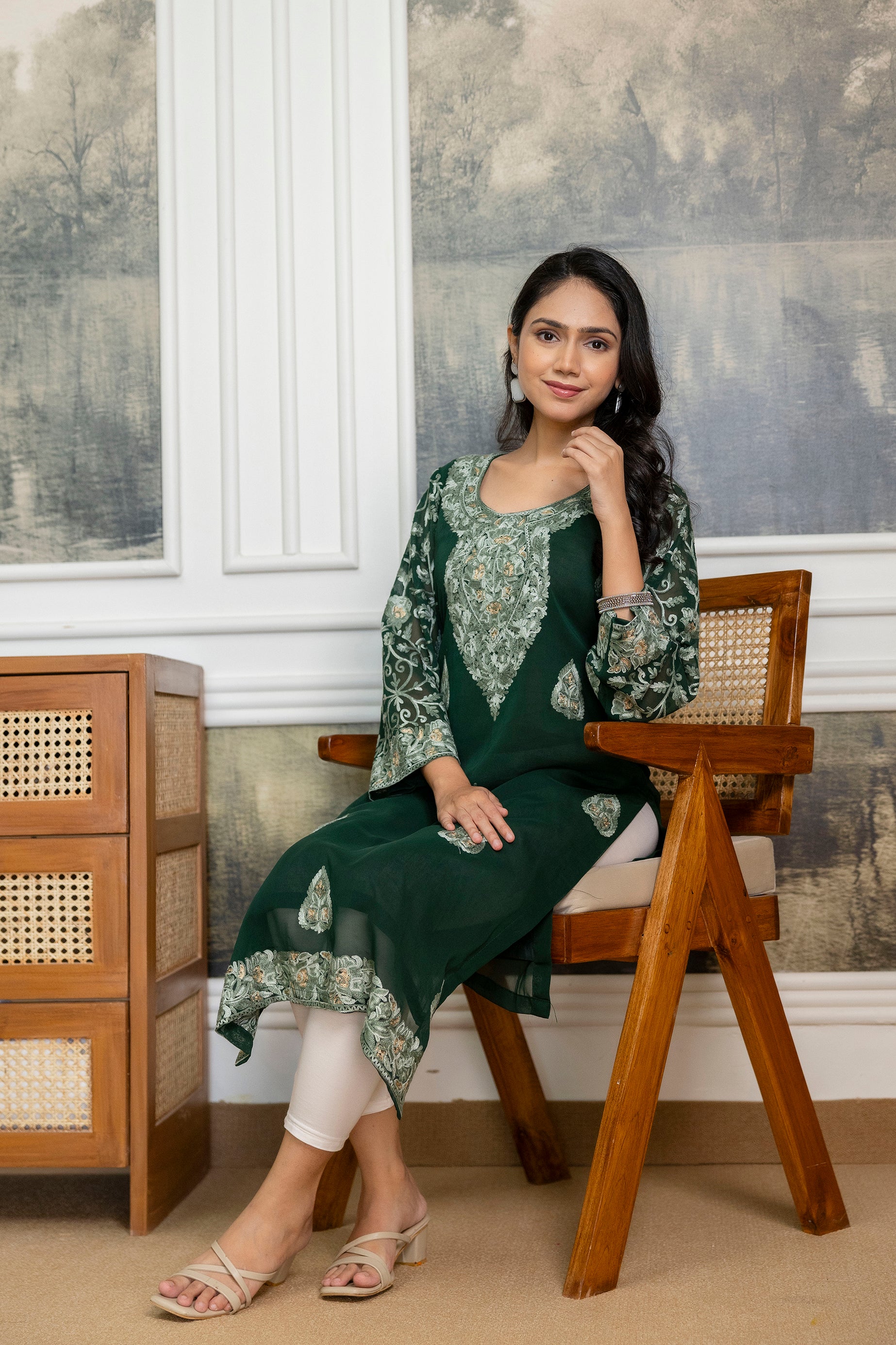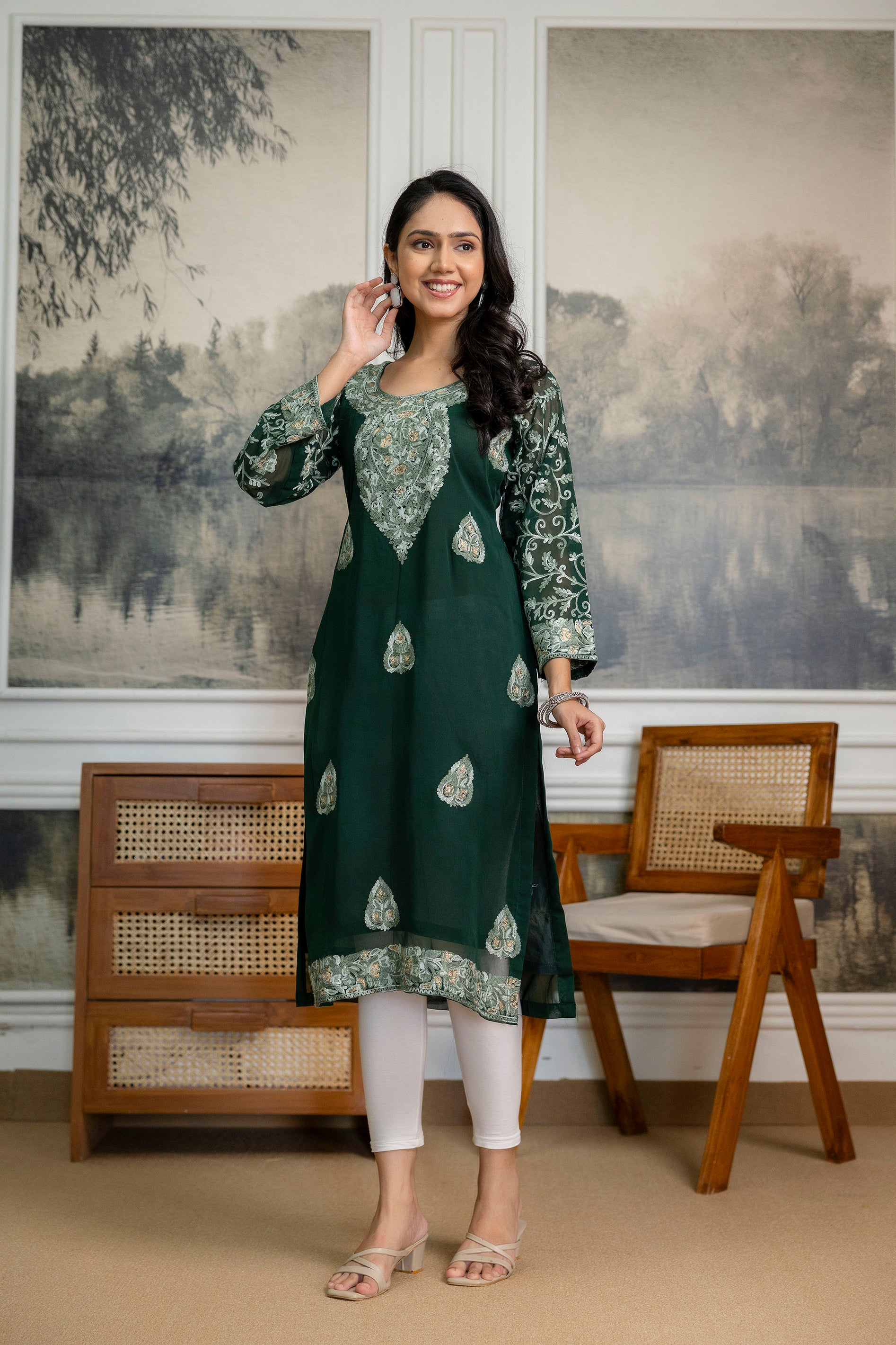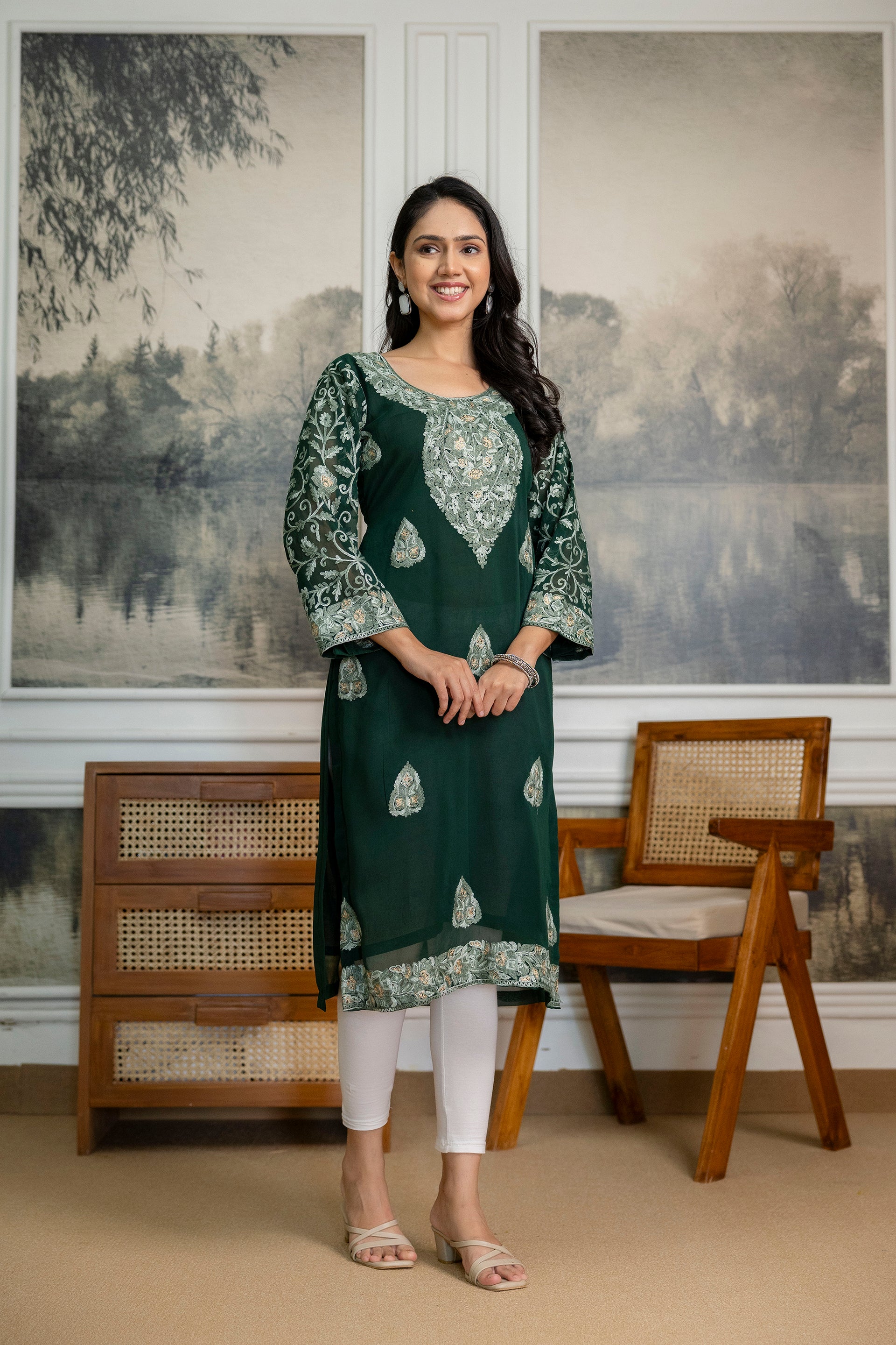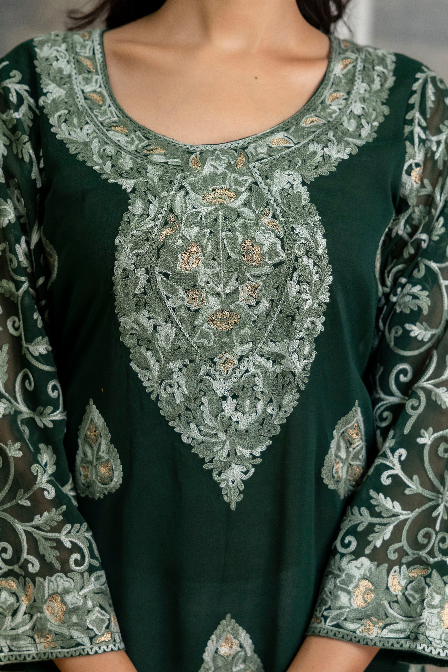 TOK Aari Embroidered Georgette Women's Long Kurta - Bottle Green
