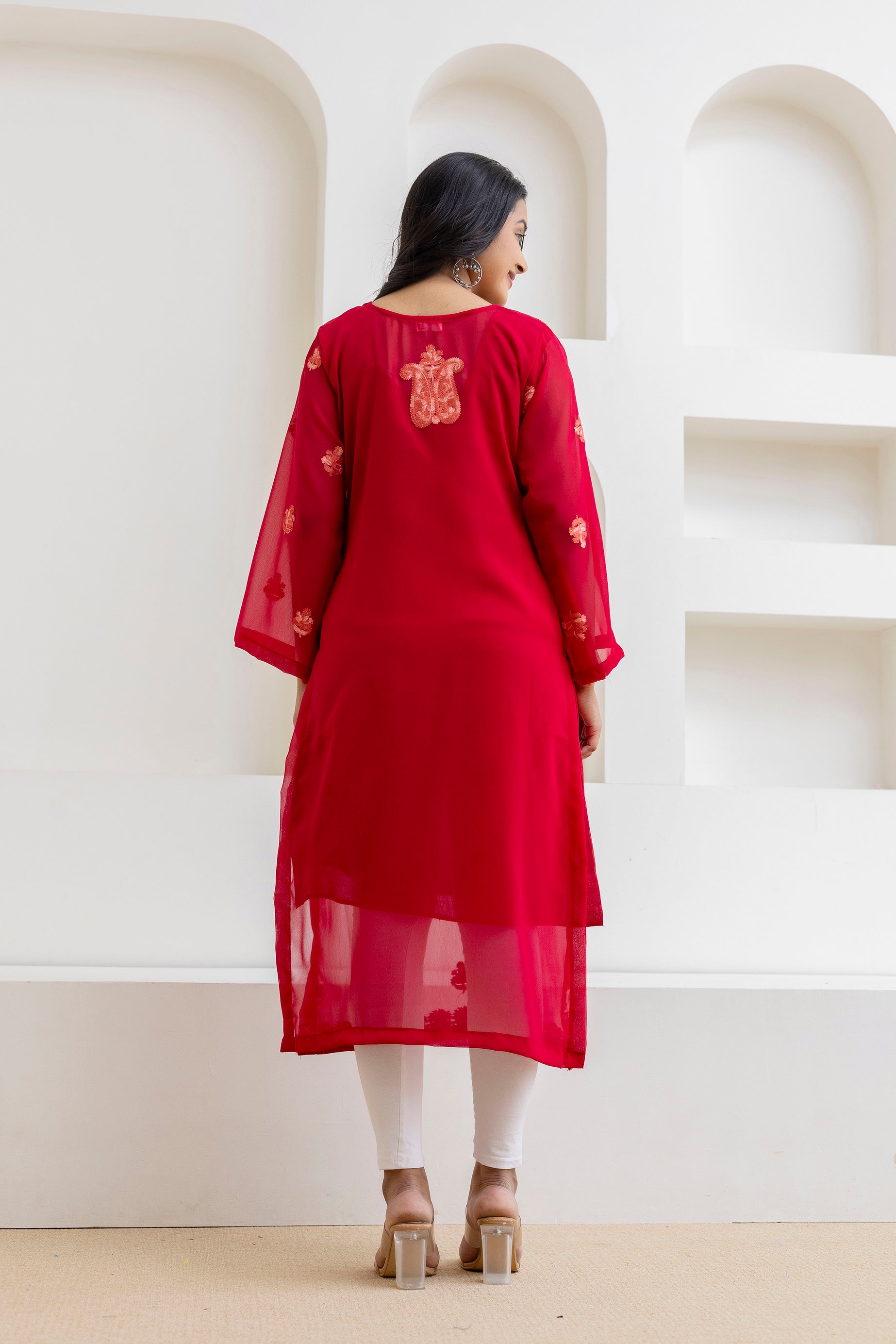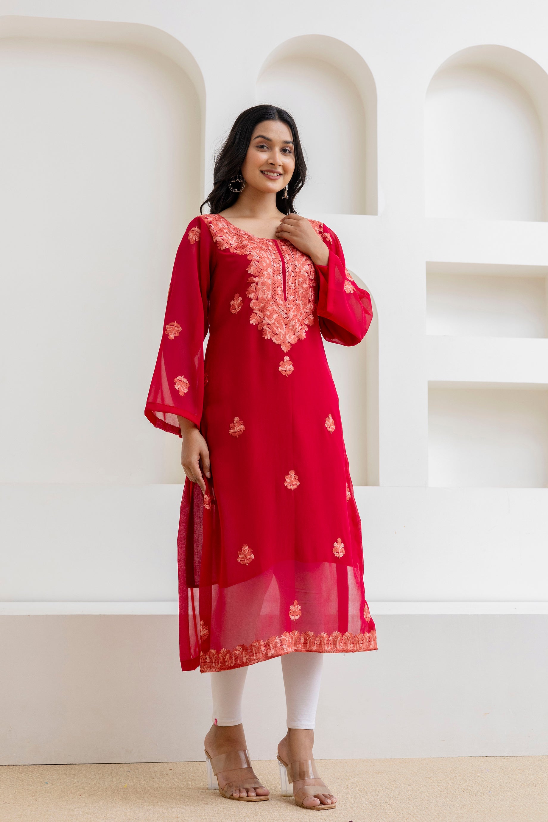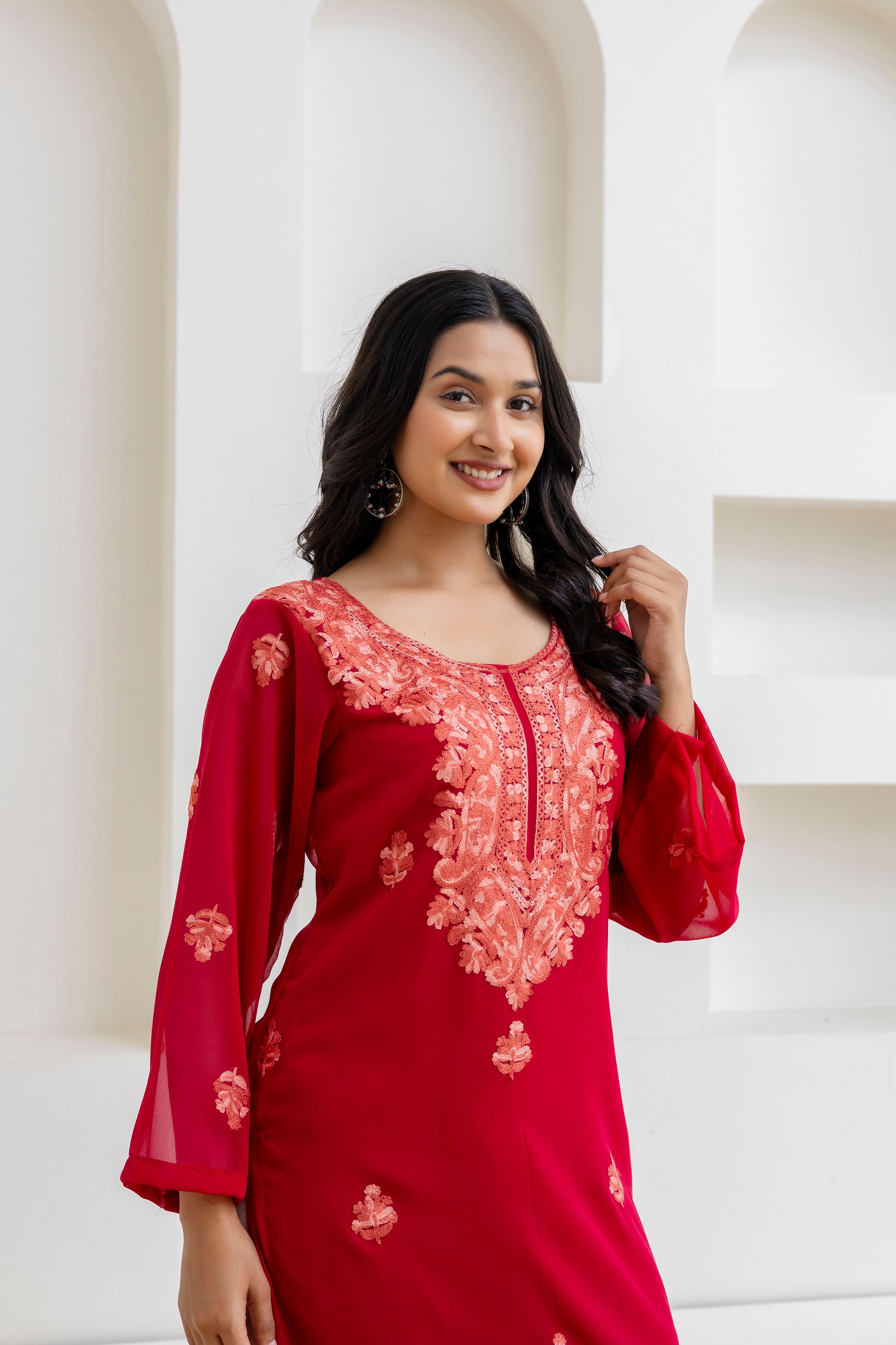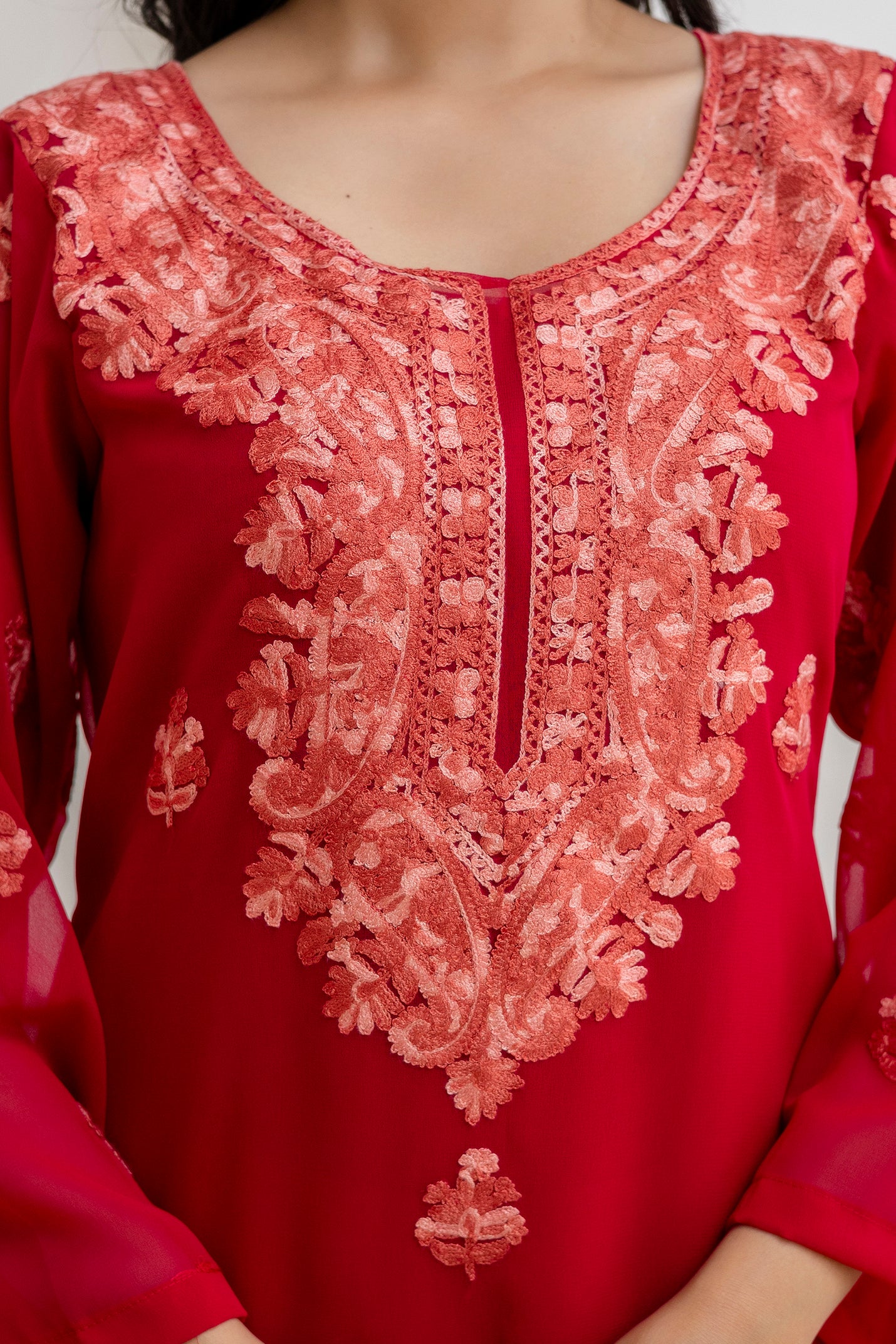 TOK Aari Embroidered Georgette Women's Long Kurta - Maroon
